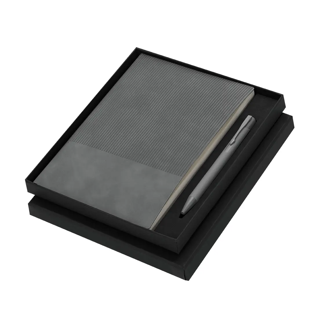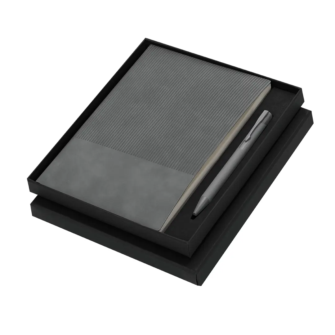 Set de bloc de notas y bolígrafo fabricados en PU Reciclado y Aluminio Reciclado. El set incluye: – Bloc de notas fabricado en PU Reciclada, con tapas flexibles . Incluye 96 páginas de color crema con líneas, un marcapáginas a juego. Con distintivo PU Reciclada. – Bolígrafo de aluminio reciclado, con cuerpo en acabado caucho. Dispone de clip mecanismo pulsador y tinta azul. Incluye distintivo de aluminio reciclado.