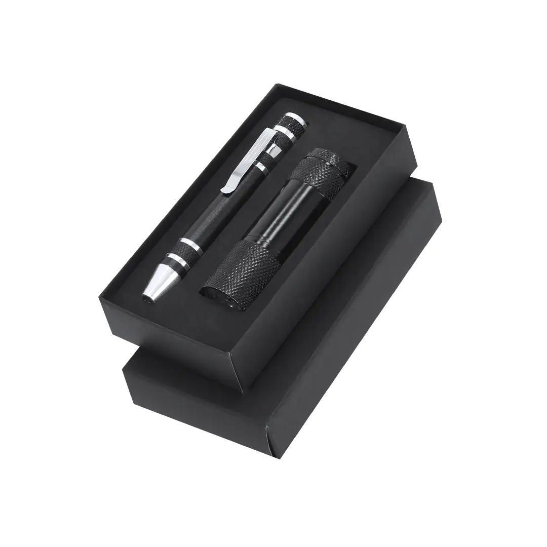 Set de Herramientas Multifuncional con Linterna y Destornillador en aluminio. Incluye:- Destornillador con 6 cabezales imantados: 3 planos y 3 de estrella, equipado con un práctico clip metálico que facilita su enganche y transporte.- Linterna LED con 9 LEDs, alimentada por 3 pilas AAA (no incluidas). Incorpora cordón para muñeca, ofreciendo comodidad y seguridad en su manejo.Presentado en caja negra.