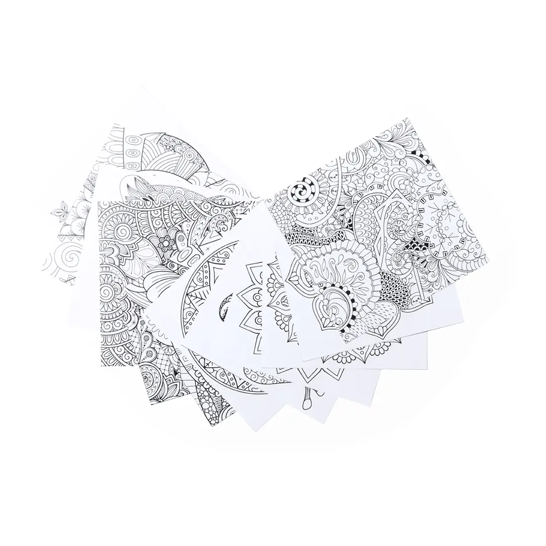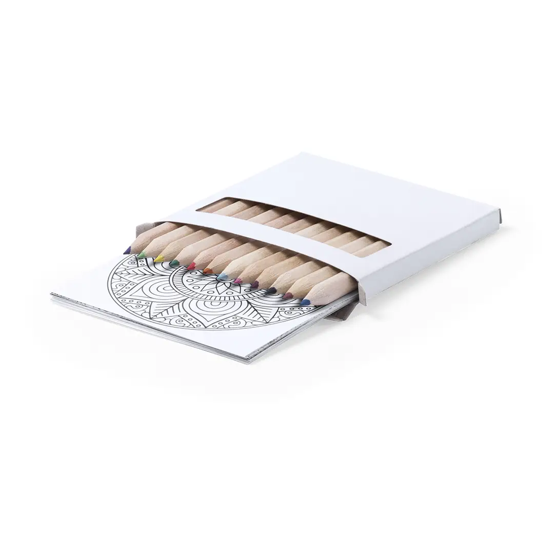 Set de lápices y láminas para colorear con diseños mandala para colorear y relajarse. Incluye 12 lápices de cuerpo hexagonal y 12 láminas con diseños diferentes. Presentado en estuche de cartón con ventana.