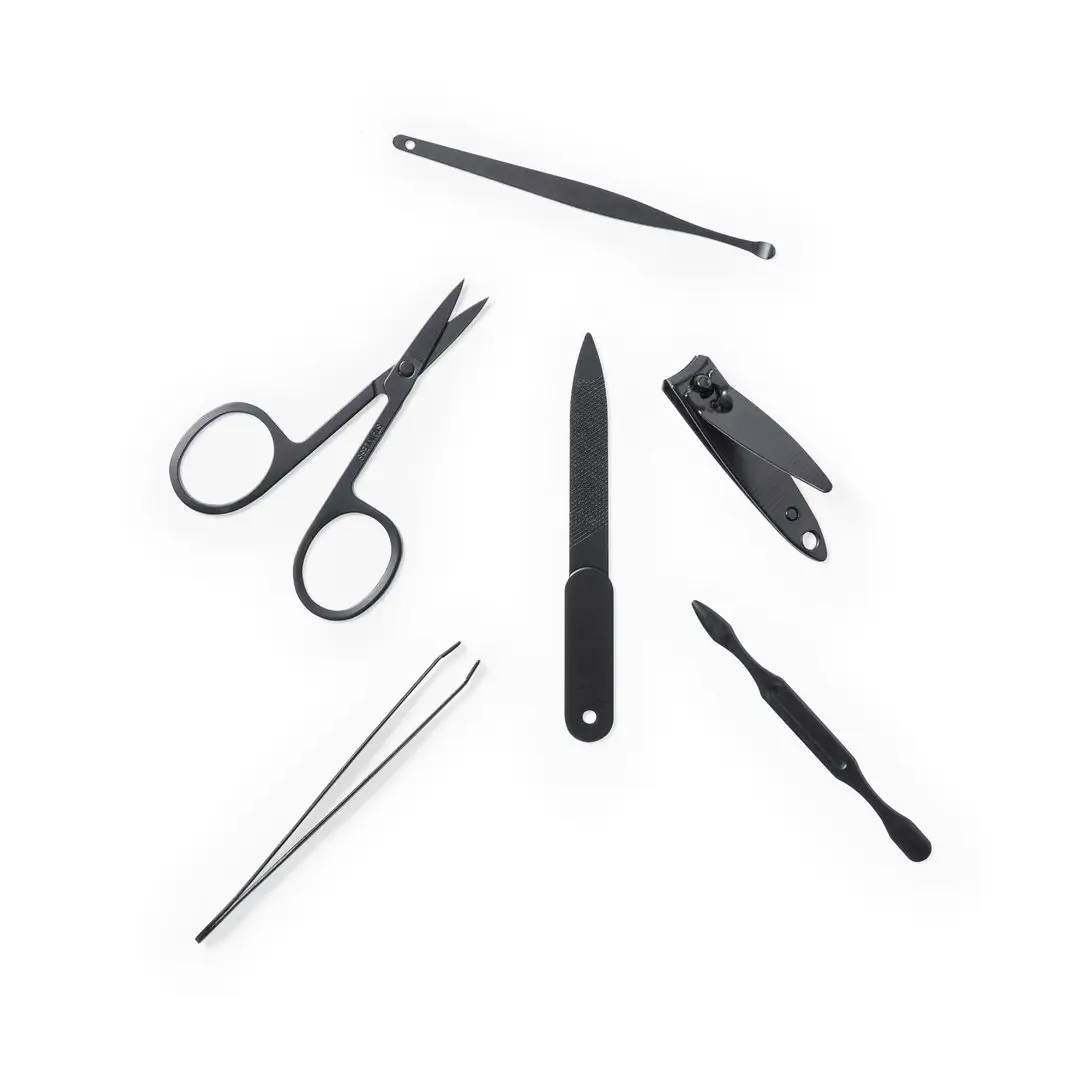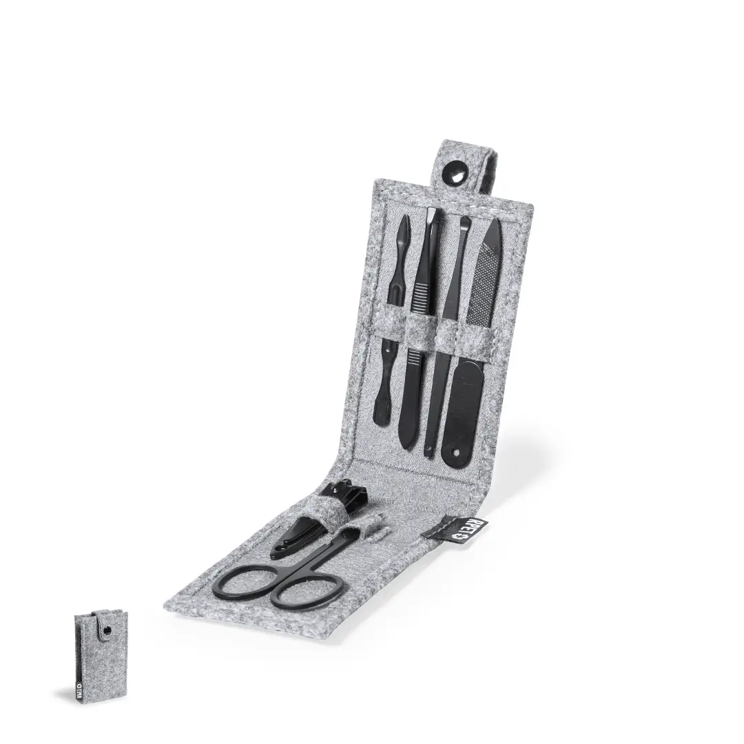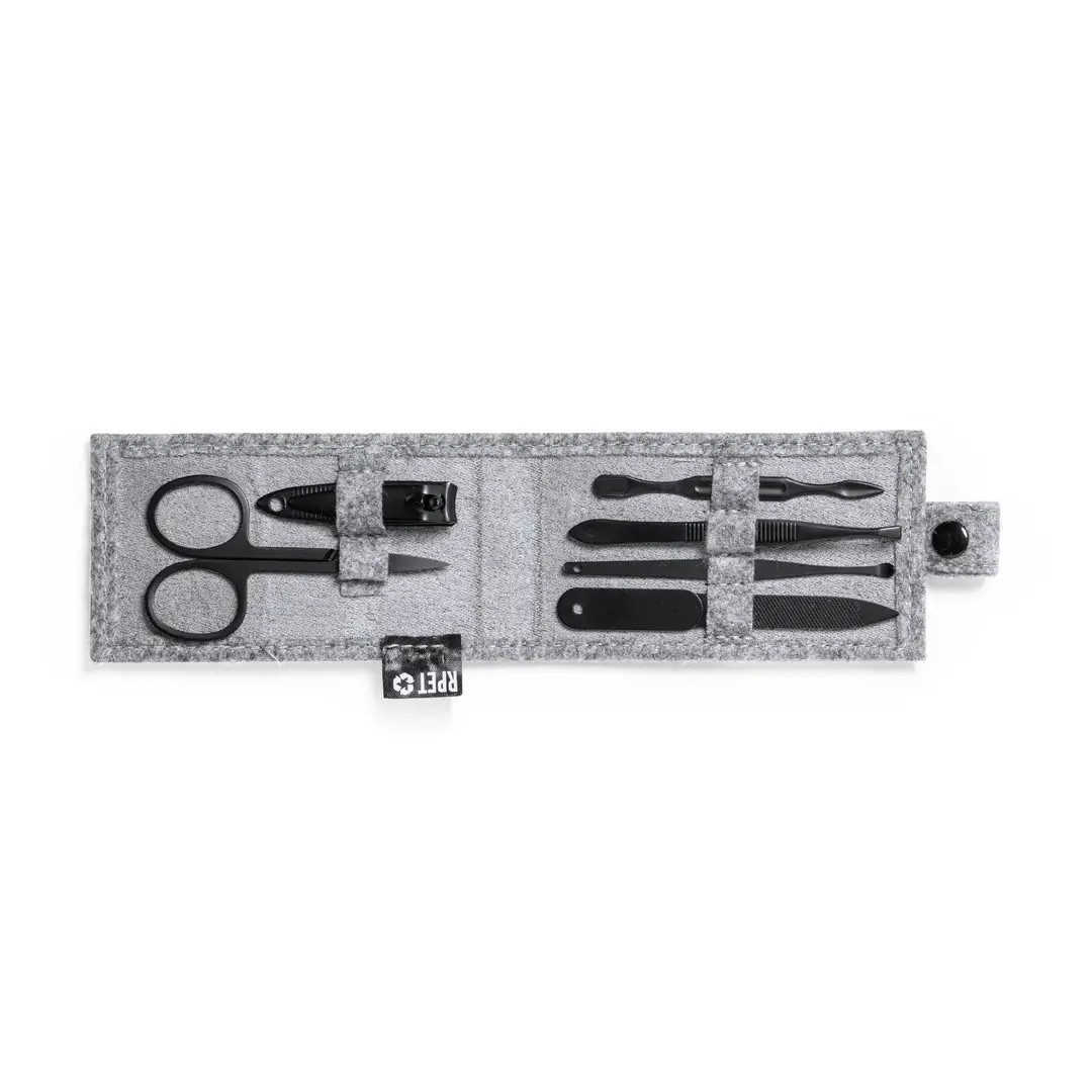 Set de manicura de 6 accesorios, con funda fabricada en resistente fieltro RPET, fruto de la combinación del proceso de reciclaje de materiales plásticos junto con la técnica milenaria de fabricación del fieltro, dando como resultado un material de eco-tendencia que, además de ser de origen reciclado, también se convierte en reciclable. Accesorios metálicos en acero inox de acabado negro: tijeras, pinzas, cortaúñas, lima y 2 quitacutículas. Con cierre de botón y etiqueta distintiva RPET en exterior.