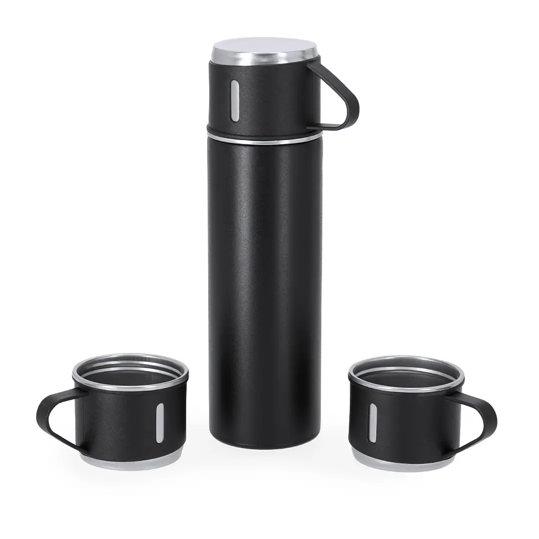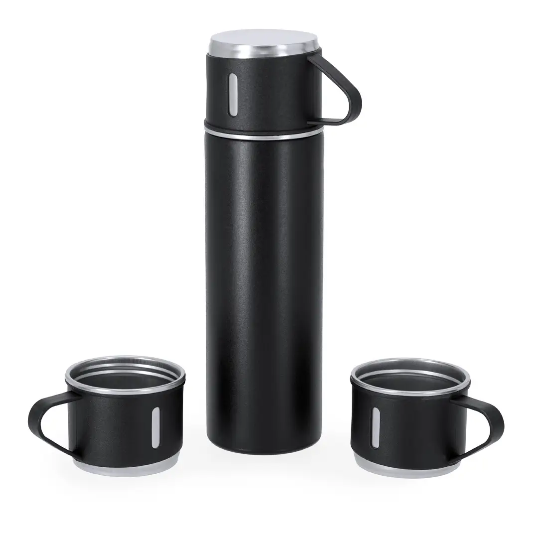 Set de termo con 3 tazas fabricado en acero inox. Termo de 420 ml de capacidad y de doble pared, que garantiza una mejor y más duradera conservación de la temperatura, con dosificador de seguridad. Tazas de 140ml, ajustables mediante rosca y en elegante diseño negro, ideales para disfrutar de la bebida, ya sea caliente o fría, en cualquier momento y lugar. Presentación en elegante estuche de color negro.