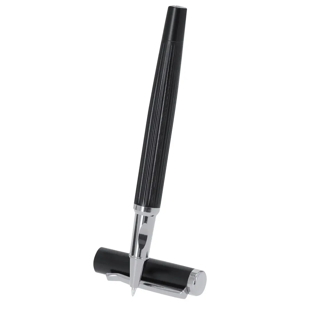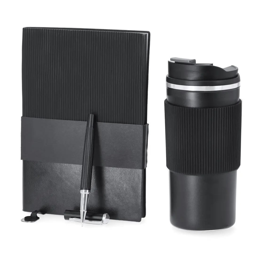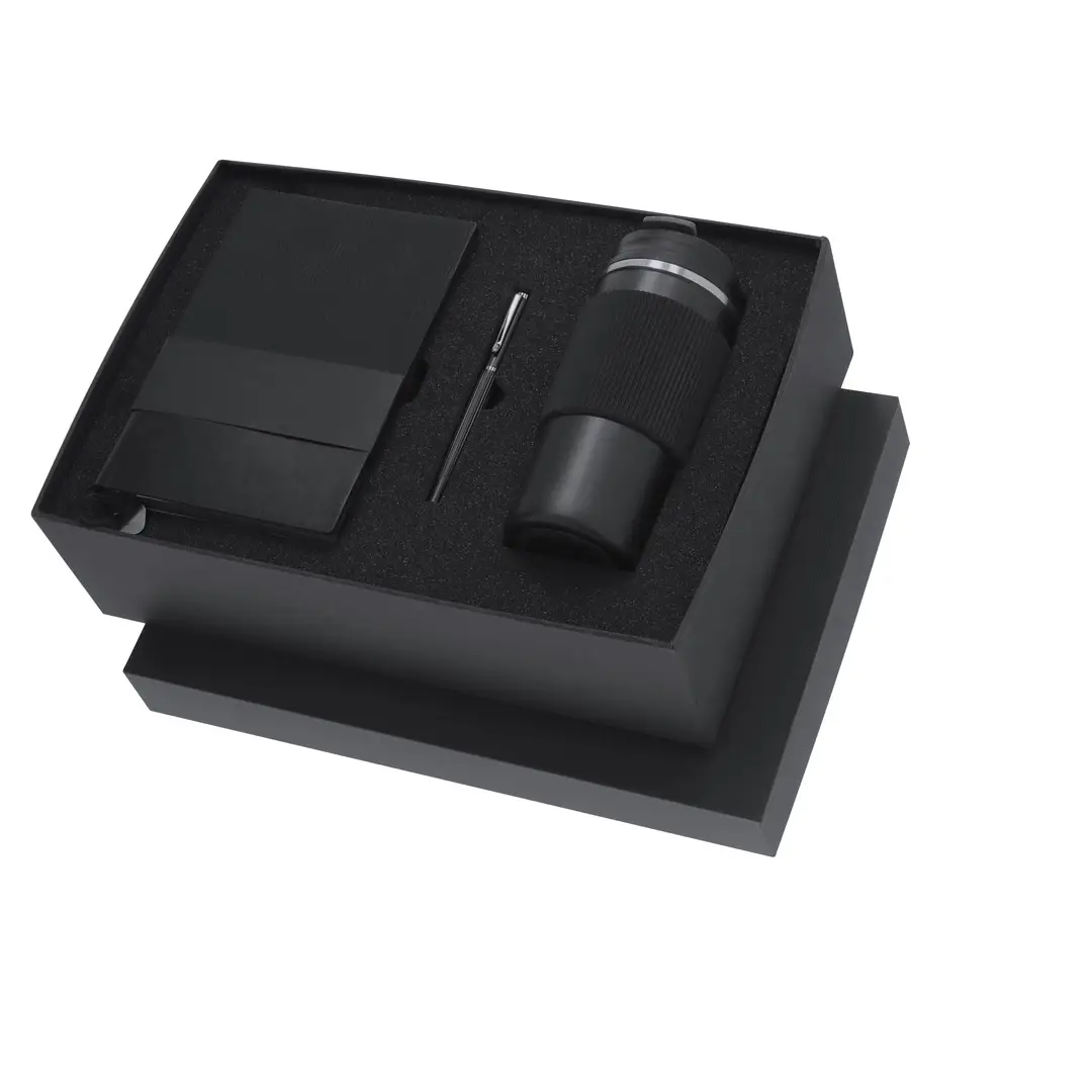 Elegante set premium. Incluye: – Vaso térmico fabricado en acero inoxidable de doble pared con capacidad de 470 ml. Con un dosificador en tapadera, libre de BPA, sistema de apertura abre fácil, banda de silicona a juego y base antideslizante. – Bloc de notas con tapas blandas fabricado en elegante PU color negro. Su diseño combina texturas lisas y biseladas. Incluye marcapáginas de tela con accesorio metálico especial para marcaje en láser. Interior con 100 hojas en color crema, de disposición a una raya y bordes en negro. – Roller de acabado negro mate con detalles metálicos en color plata. De cuerpo biselado, con cierre de capucha, clip y tinta azul. Cuenta con cómodo agarre en metal pulido.Presentado en sosfisticado estuche individual de acabado mate, con interior troquelado para cada uno de los elementos del set.