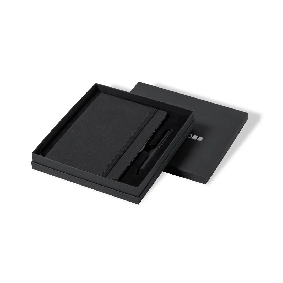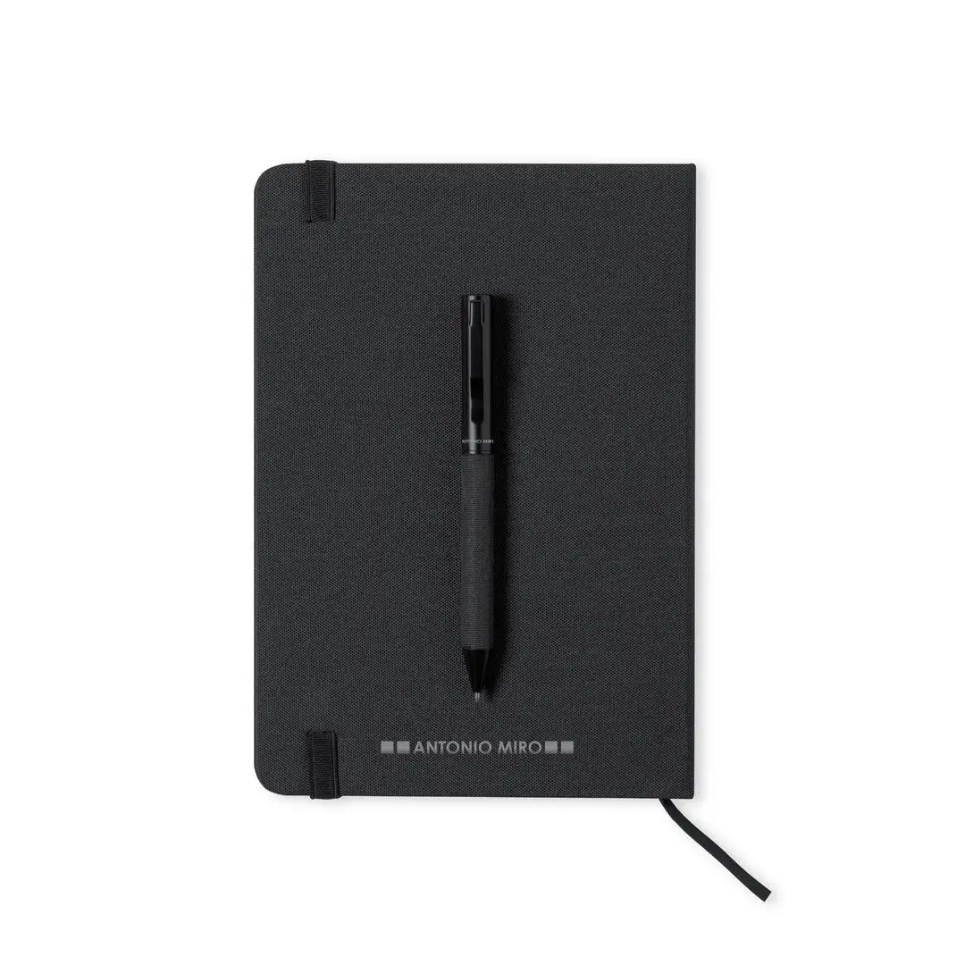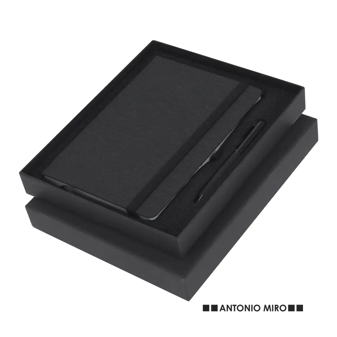 Set de bloc de notas y bolígrafo de Antonio Miró. Incluye: Bloc de notas de elegante acabado en negro, fabricado en resistente poliéster 300D, con tapas rígidas y elástico de sujeción a juego. Interior con 100 hojas de disposición a una raya. Bolígrafo metálico de mecanismo giratorio y en tinta azul. Con cuerpo y detalles en negro, clip metálico y logotipo de la marca. Set presentado en elegante y resistente caja individual negra con logotipo Antonio Miró y funda de protección a juego.