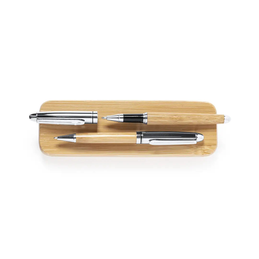 Set de bolígrafo y roller de línea nature. Fabricado en combinación de bambú con metal, para así fomentar la utilización de materias primas naturales y reducir las emisiones contaminantes. Bolígrafo de mecanismo giratorio en tinta azul. Roller con capucha, tinta gel en azul y carga jumbo. Presentado en estuche individual de bambú.
