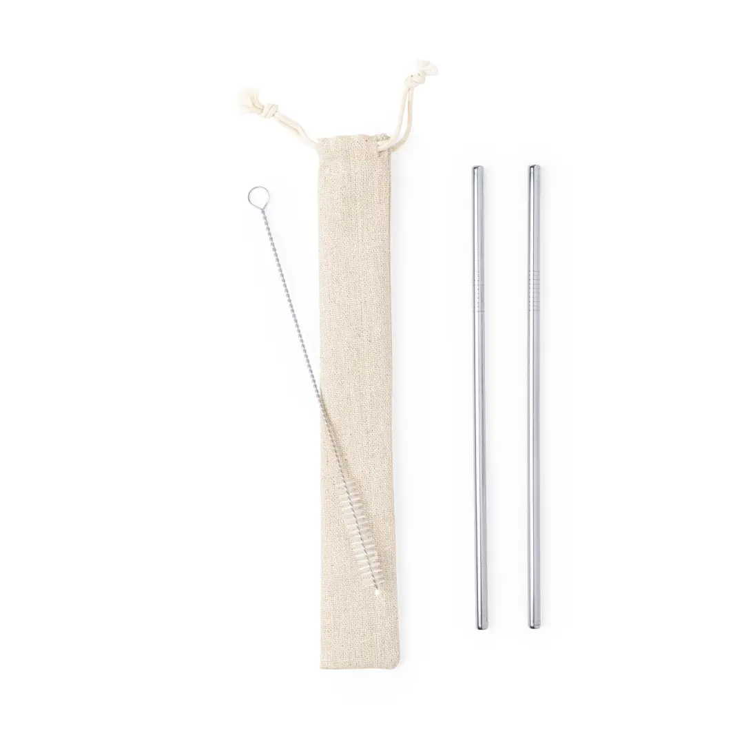 Set de 2 pajitas reutilizables en acero inoxidable. Con accesorio limpiador incluido y presentadas en bolsita de algodón natural con cuerdas autocierre.