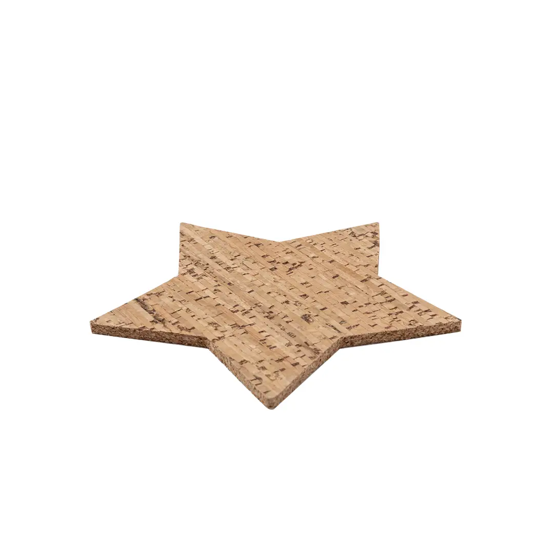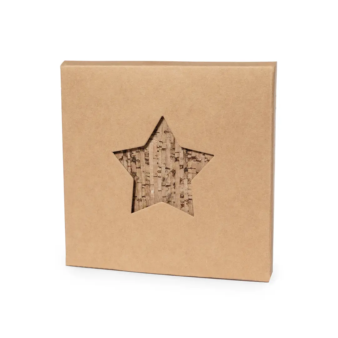 Set de 4 posavasos con forma de estrella fabricados en corcho natural. Set presentado en caja de diseño en cartón kraft con diseño de estrella troquelado.Elaborado con elementos vegetales para así fomentar la utilización de materias primas naturales y reducir las emisiones contaminantes.