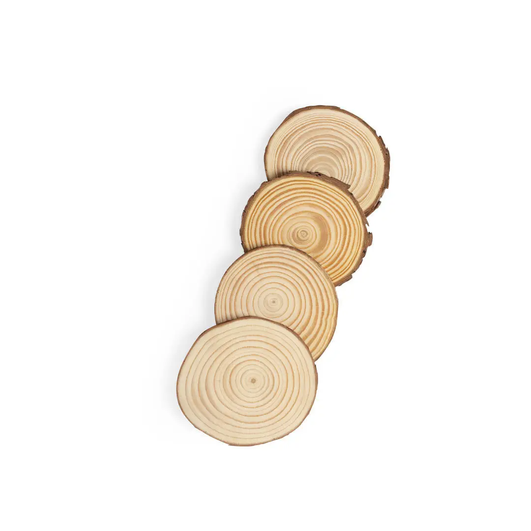 Set de posavasos en madera de pino natural. Incluye 4 piezas de aproximadamente 1cm de grosor. Corte natural, con diámetros de posavasos entre 8 y 10 cm, con cuerda en yute natural.