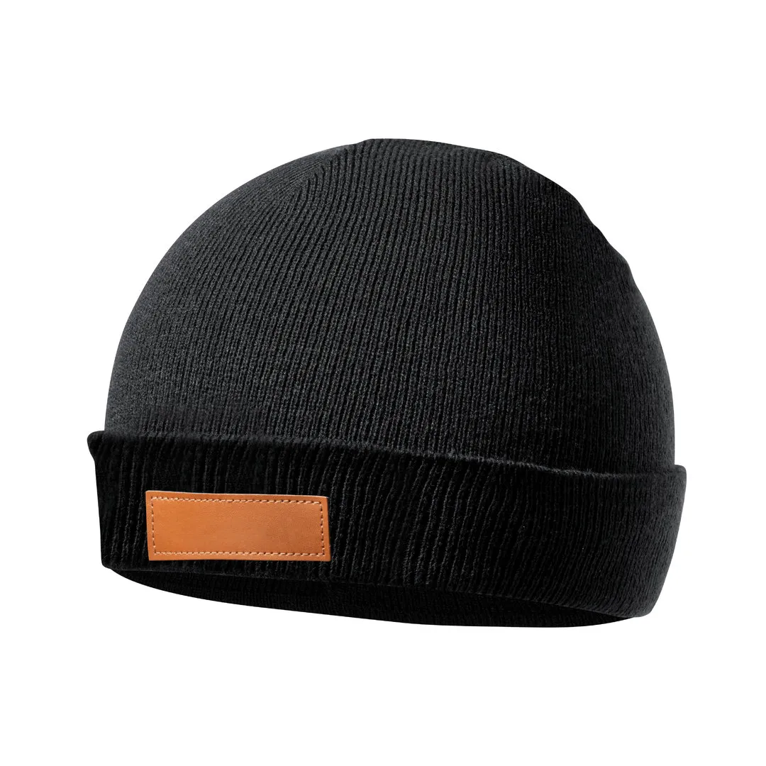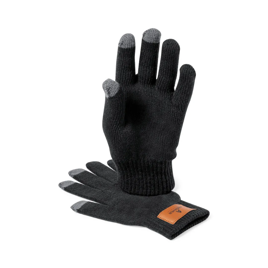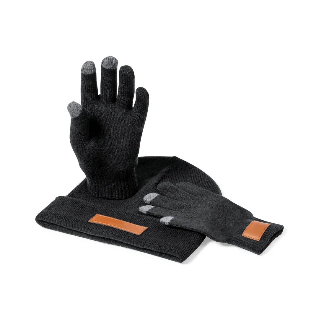 Set de gorro y guantes en talla adulto, fabricados en material acrílico elástico y con parche en polipiel cosido para marcaje. Incluye: Par de guantes con 3 dedos táctiles y elástico de ajuste en muñeca. Gorro a juego con dobladillo.