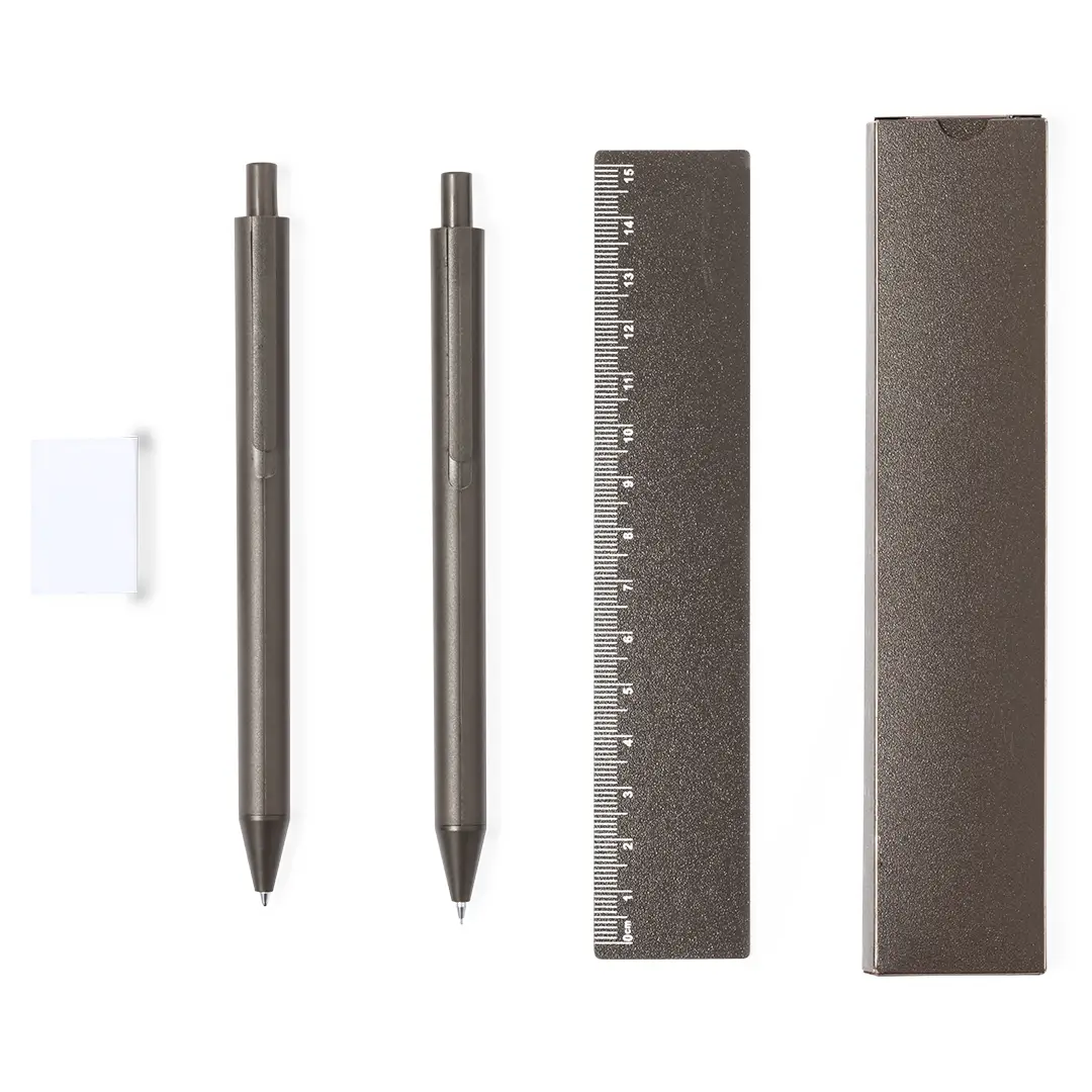 Set de bolígrafo, portaminas y regla, fabricados en fibra de café. Bolígrafo en tinta azul y portaminas con 2 minas incluidas de 0,7mm, ambos con clip. Incluye una práctica regla de 15 cm y útil goma. Presentado en estuche individual de fibra de café. Logotipo fibra de café en la parte superior del bolígrafo y portaminas.La fibra de café es una solución circular que se obtiene de la utilización de los residuos producidos en la obtención del café. Una alternativa sostenible que favorece la reducción del uso de plásticos, ahorrando energía en su proceso de fabricación y contribuyendo al cuidado del medio ambiente.