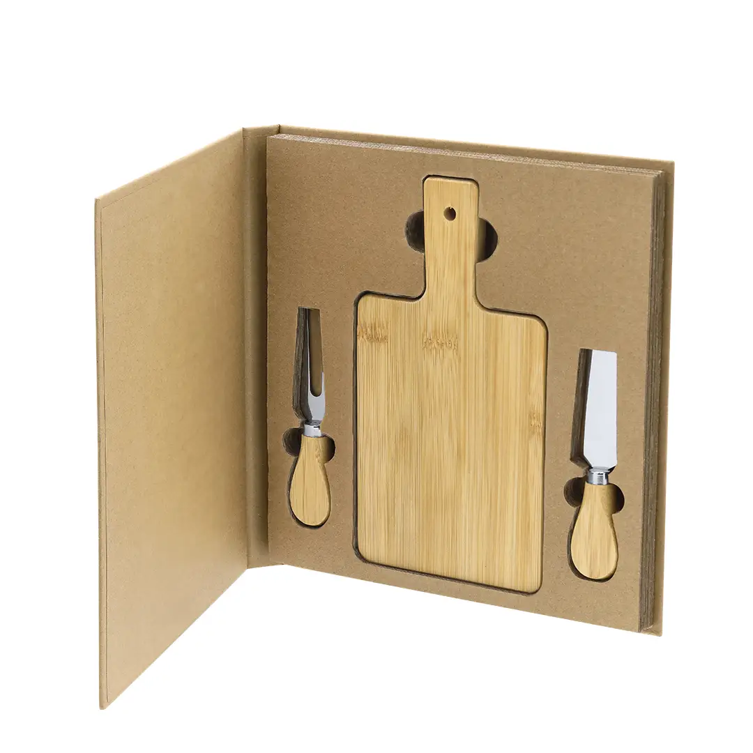 Completo set de quesos de línea nature, fabricado en bambú y acero inoxidable. Incluye tabla de corte y presentación con mango y agujero para colgar, trinchador y cuchillo. Presentado en estuche individual troquelado de cartón reciclado acabado kraft.