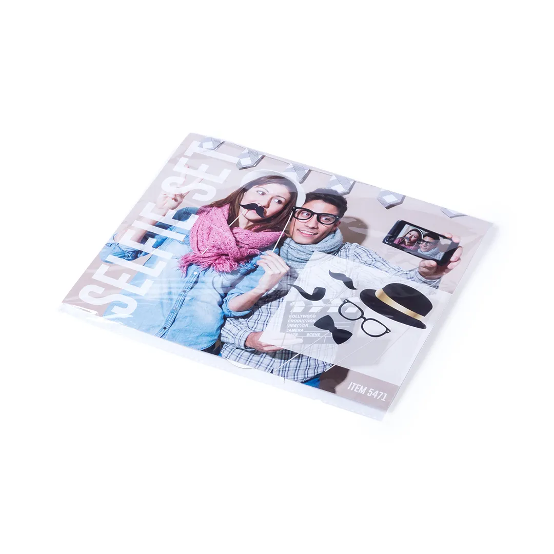 Set selfie de 5 piezas con divertidos accesorios sombrero, pipa, bigote, palomita y gafas. En papel de alto gramaje con mango de madera. Presentado en atractiva bolsa de diseño con auto cierre.