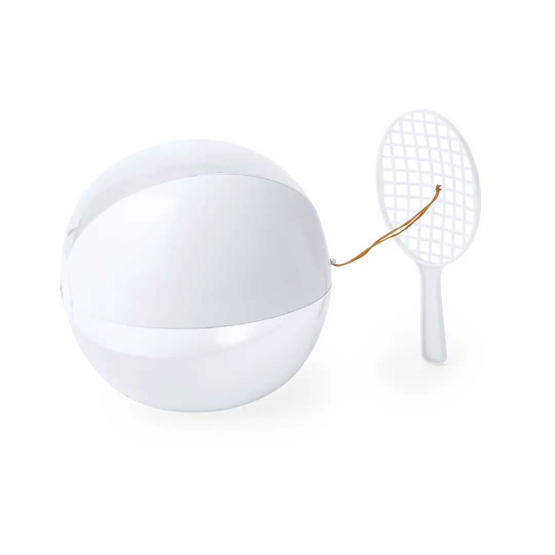 Divertido set de raqueta y balón con válvula de inflado en combinación de blanco y translúcido, unidos por un elástico. Presentado cada set en bolsa reciclada.