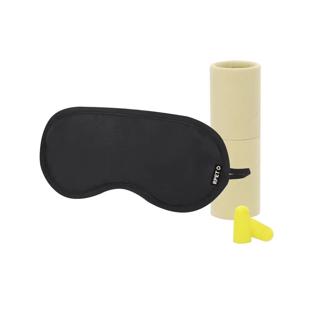 Set de viaje con antifaz y tapones para oídos. Antifaz en suave y confortable RPET con elástico de ajuste a juego, con distintivo en etiqueta. Tapones en confortable material EVA de color amarillo. Presentado en práctico estuche cilíndrico en cartón kraft. El material RPET se elabora a partir de plástico reciclado, para así fomentar la reutilización de residuos plásticos y ayudar a la sostenibilidad del planeta.