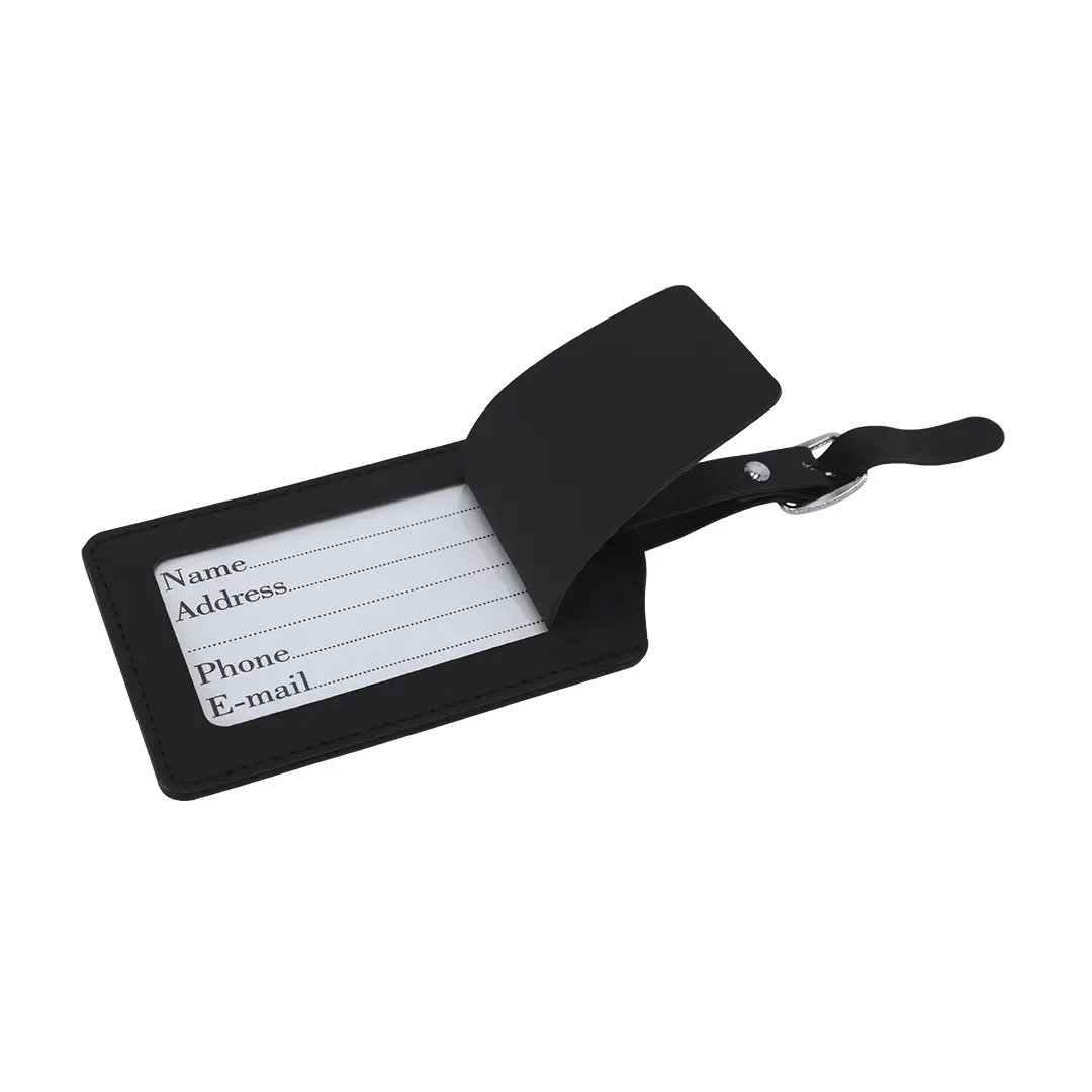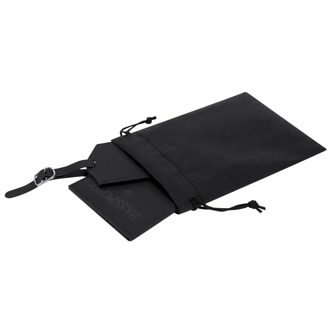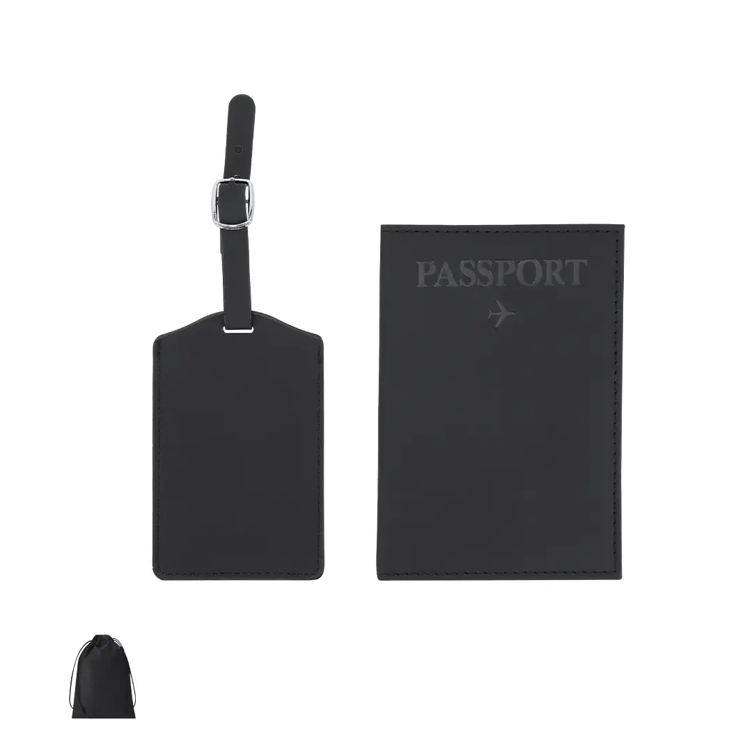 Set de viaje compuesto por funda para pasaporte y etiqueta de equipaje, fabricados en suave PU . Funda equipada con compartimento especial para pasaporte, además de compartimento para tarjeta. Etiqueta ajustable correa con hebilla plateada que incluye etiqueta con campos de datos rellenables. Presentado en funda negra.