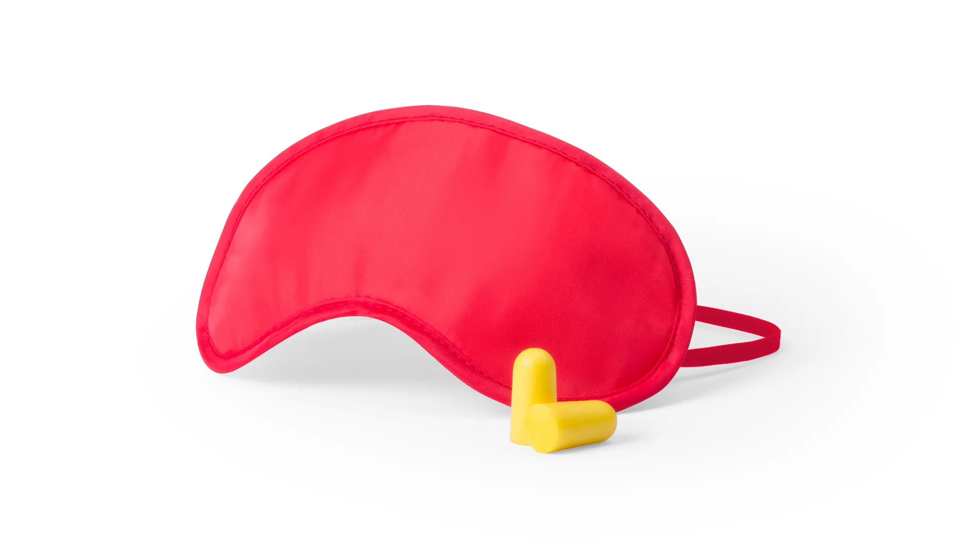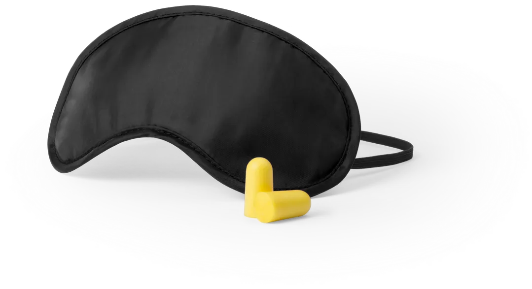 Set de viaje de mascarilla y tapones para oídos. Mascarilla en suave y confortable microfibra de vivos colores con elástico de ajuste a juego. Tapones en confortable material EVA de color amarillo. Presentado en bolsa individual.