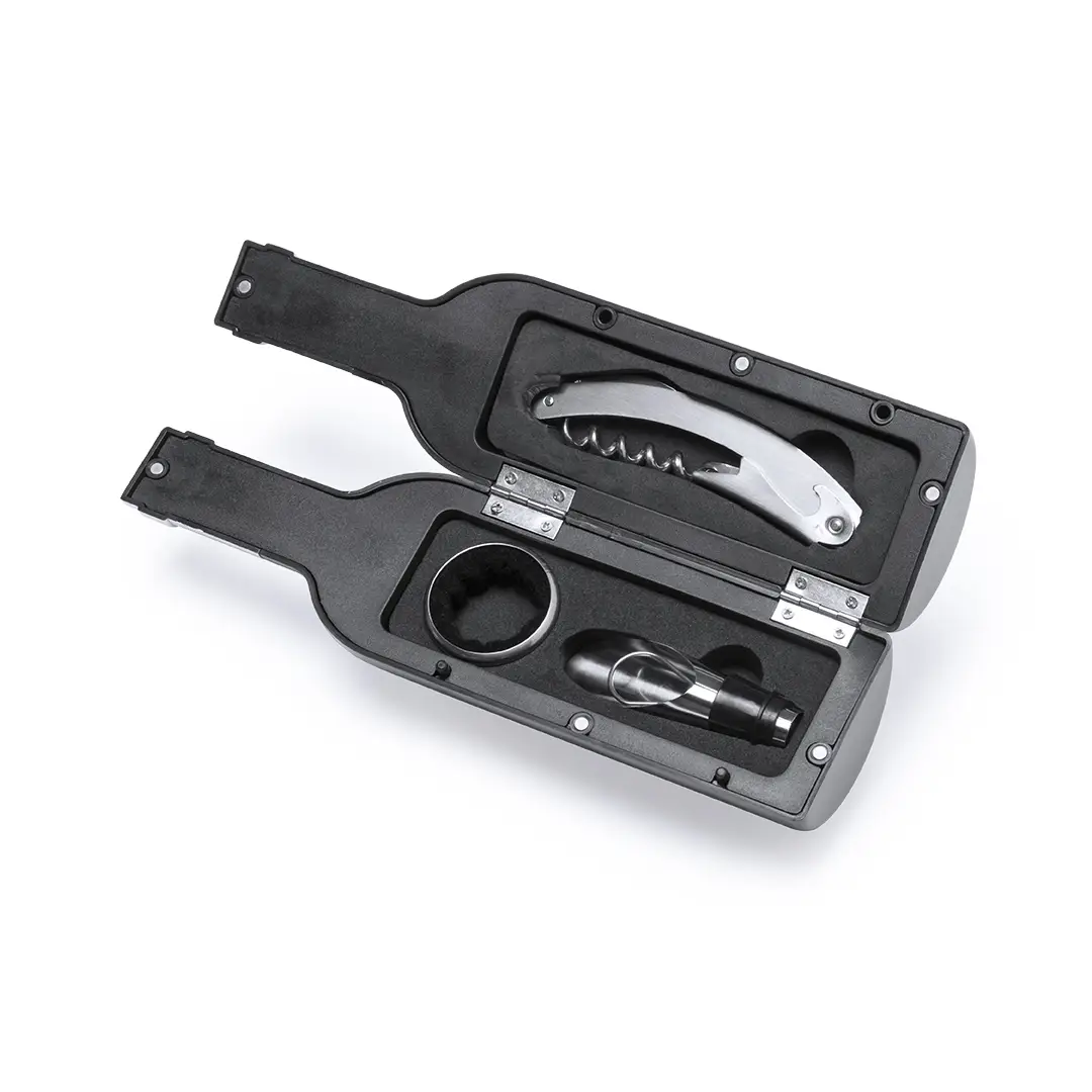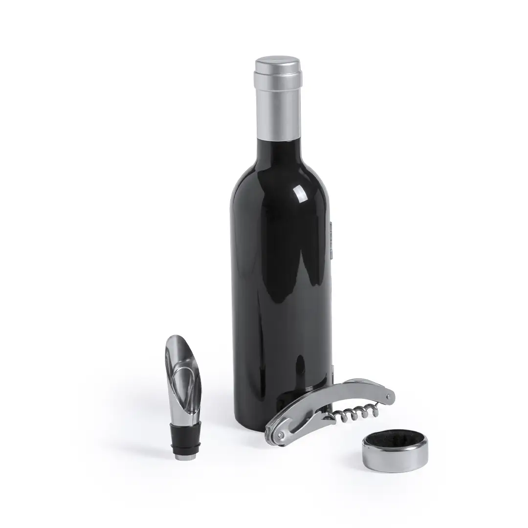 Original set de vinos en forma de botella de vino de acabado brillante, cierre magnético y accesorios de acero inox. Incluye sacacorchos con cortacápsulas y abridor, tapón dosificador, recogegotas, cortacápsulas y tapón. Presentado en estuche individual con interior en suave espuma troquelada.