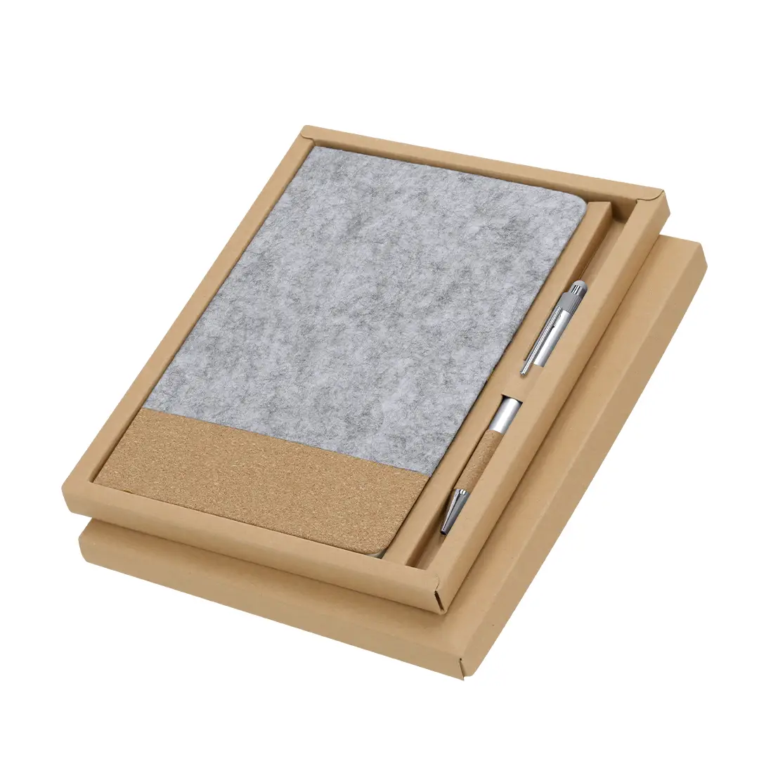 Set de bloc de notas y bolígrafo confeccionados en fieltro RPET y Aluminio Reciclado. Incluye un bloc de notas de tapas rígidas, elaboradas en fieltro RPET y corcho natural, con 80 páginas lisas, banda elástica, marcapáginas y un elástico para sujetar bolígrafos de color marrón. Además, cuenta con un bolígrafo de Aluminio Reciclado con empuñadura de corcho natural, mecanismo pulsador y tinta azul. Se presenta de manera elegante en una caja de presentación.El fieltro RPET es fruto de la combinación del proceso de reciclaje de materiales plásticos junto con la técnica milenaria de fabricación del fieltro, dando como resultado un material de eco-tendencia que, además de ser de origen reciclado, también se convierte en reciclable.
