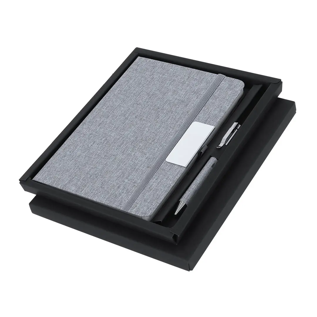 Set de bloc de notas y bolígrafo en RPET, elaborado a partir de plástico reciclado para así fomentar la reutilización de residuos plásticos y ayudar a la sostenibilidad del planeta. Incluye: Bloc de notas de tapas rígidas, con detalle metálico en la portada, marcapáginas de tela y elástico de sujeción a juego. 100 hojas interiores con disposición a una raya y distintivo RPET.Bolígrafo fabricado en metal cromado y con cuerpo recubierto en poliéster RPET. Elegante clip metálico y accesorios a juego, de mecanismo giratorio y en tinta azul. Con distintivo RPET en cuerpo.Set presentado en elegante estuche de diseño en color negro, con compartimento independiente para bloc de notas y bolígrafo.