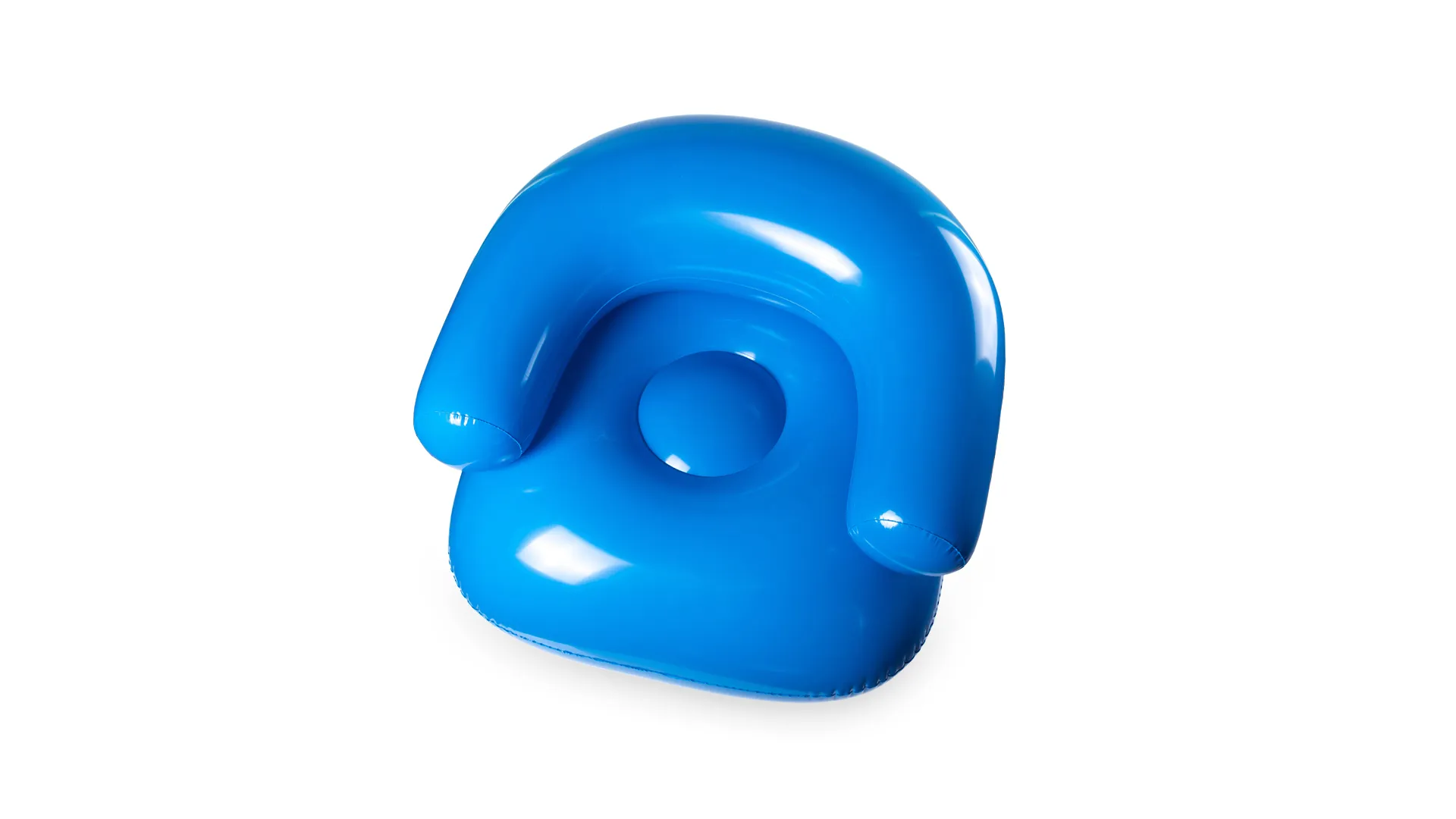 Sillón inflable en PVC de confortable respaldo y con asiento reforzado en vivos colores. Presentado con plegado especial para fácil impresión.
