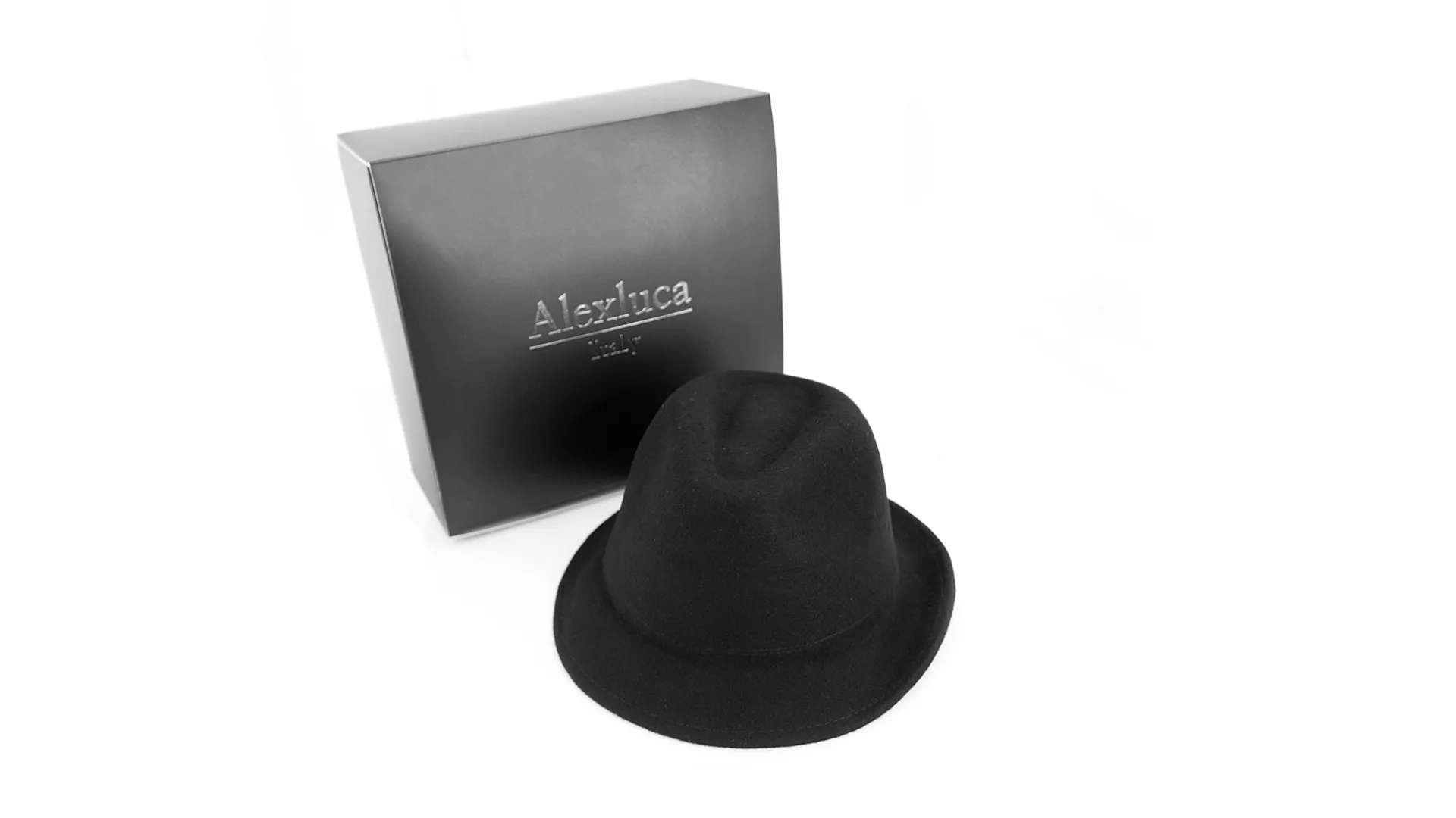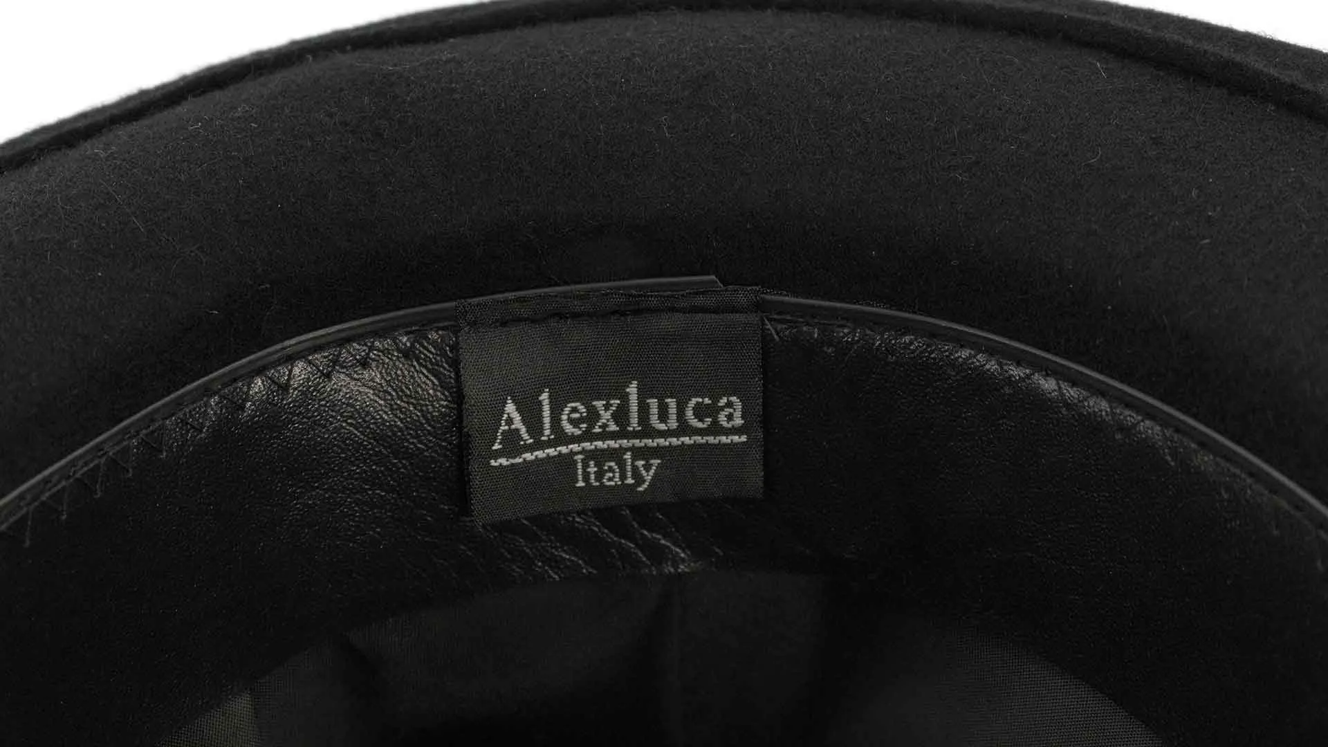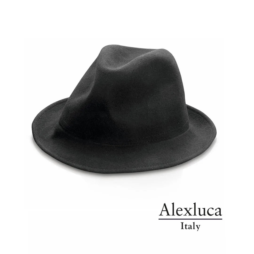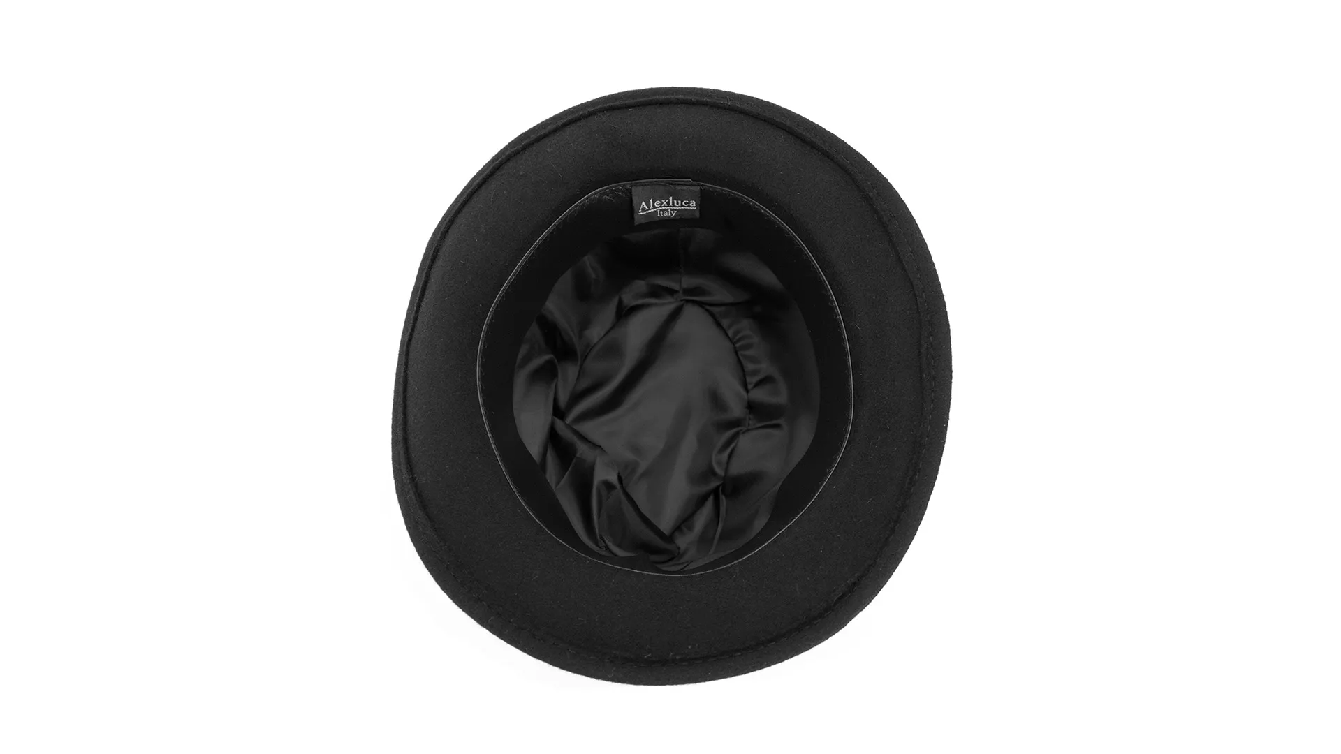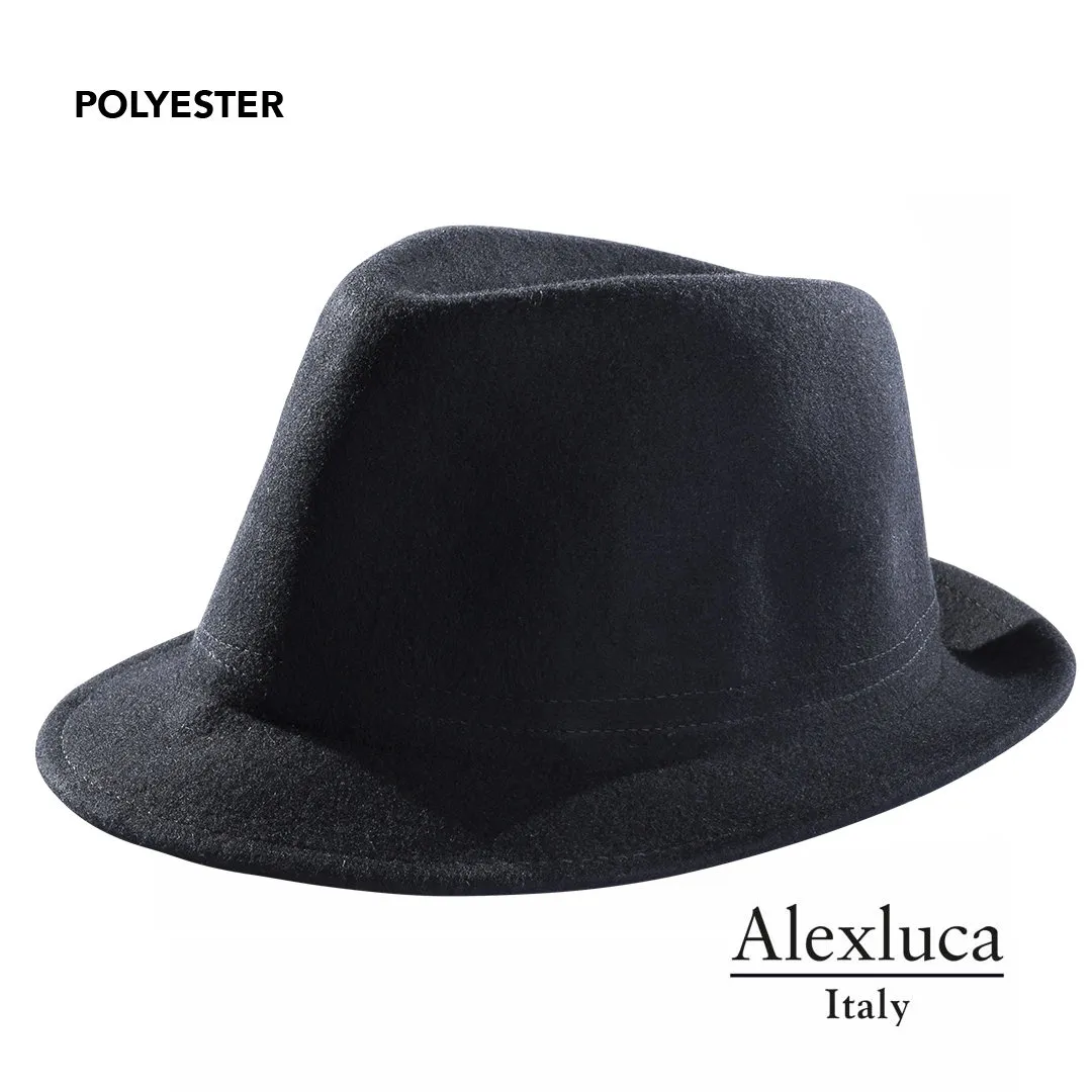 Elegante sombrero de Alexluca en suave poliéster de alta calidad y diseño en color negro. De suave interior y presentado en estuche individual con logotipo de la marca.