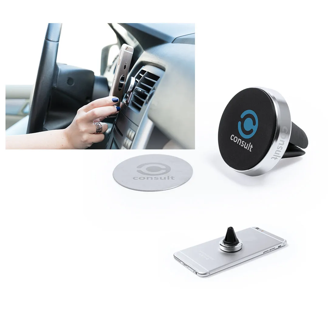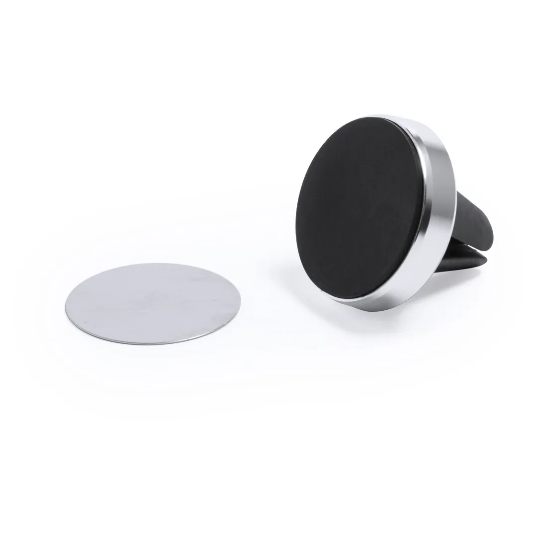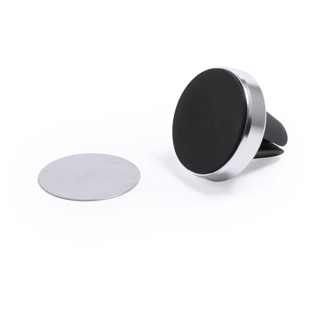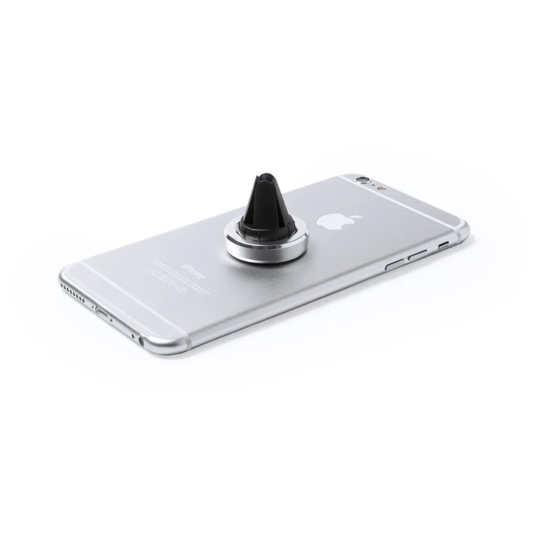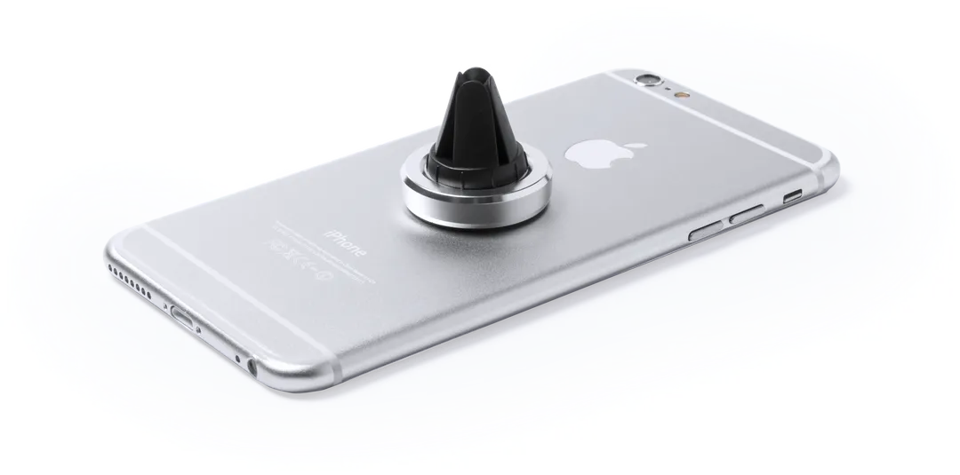 Soporte magnético para smartphone de diseño minimalista y elegante acabado en aluminio. Con sistema de fijación para rejilla de ventilación del automóvil y pastilla circular frontal especialmente diseñada para marcaje en tampografía.