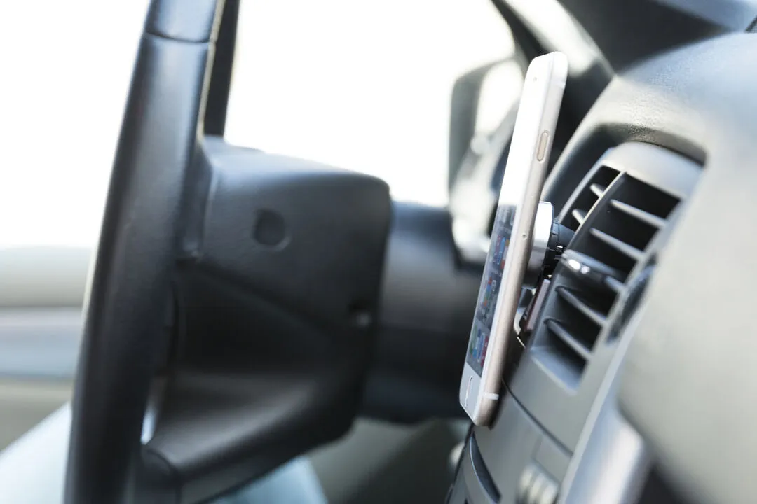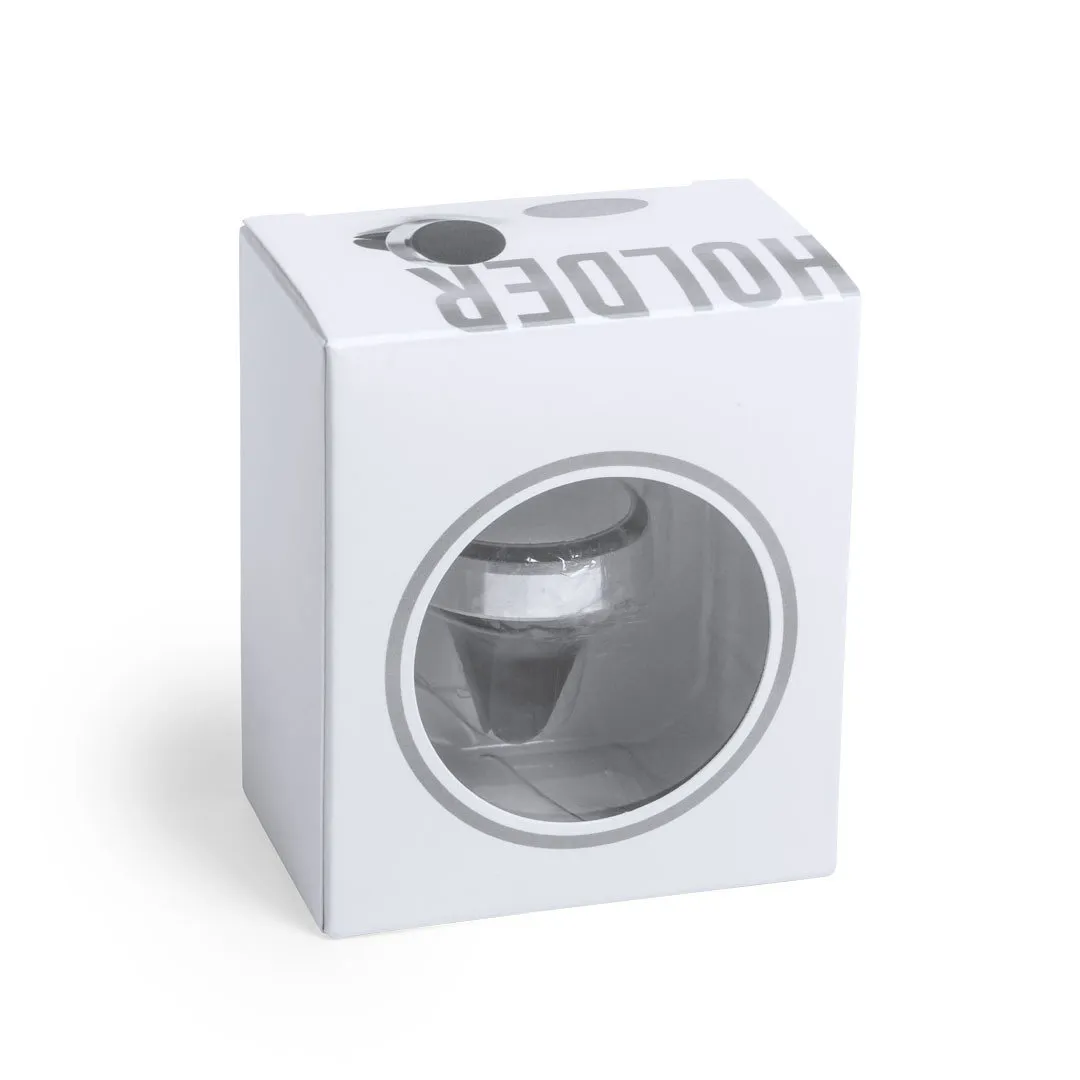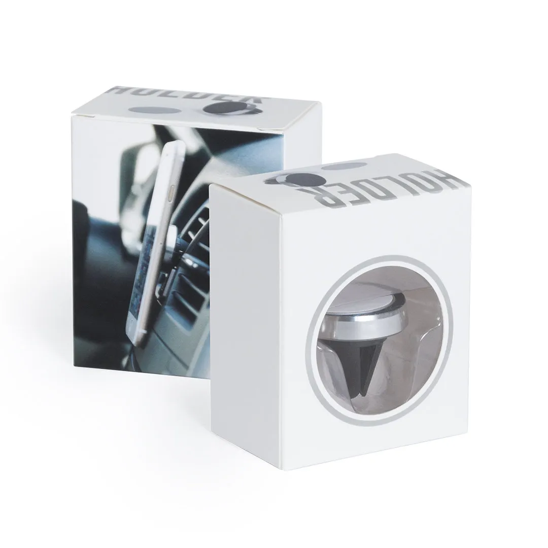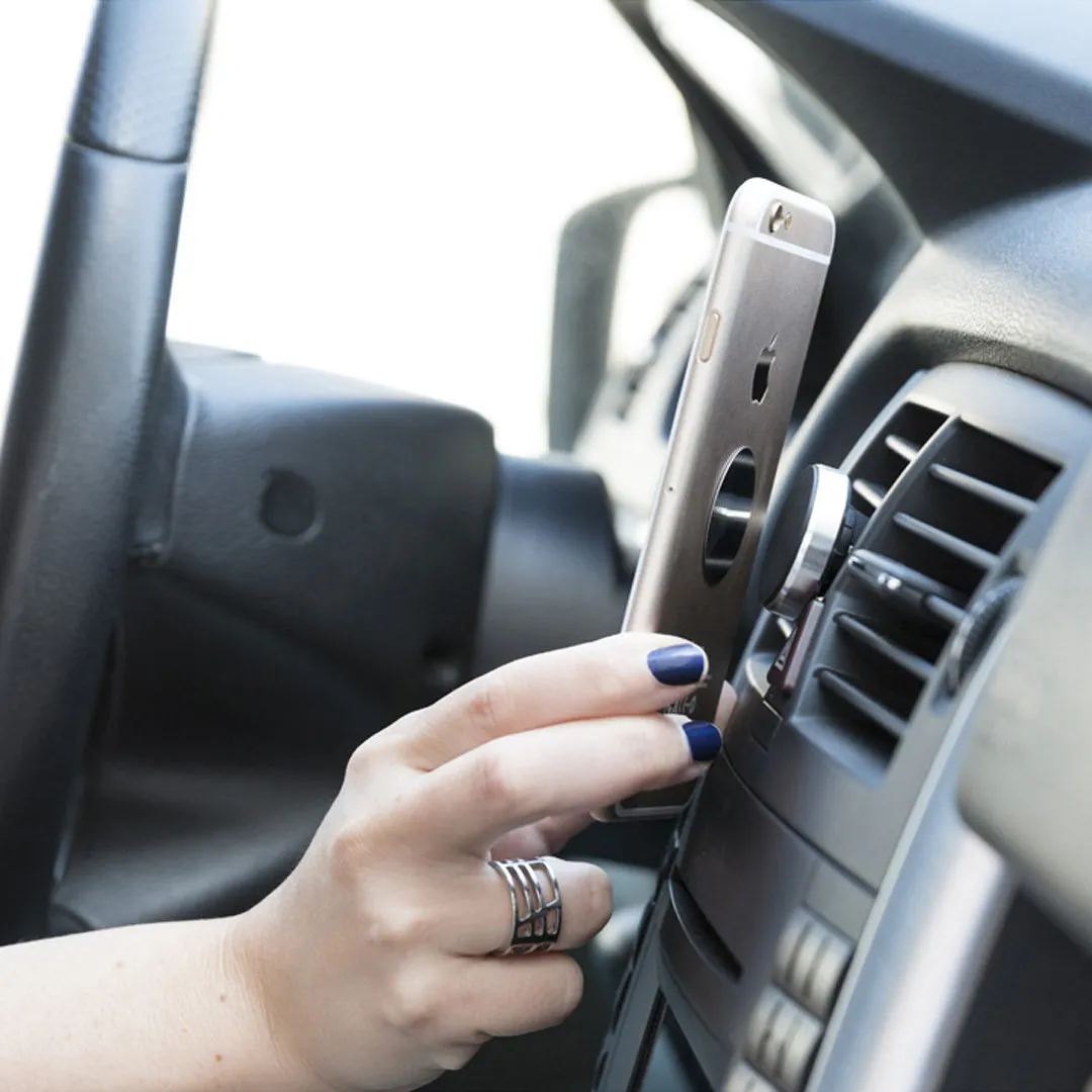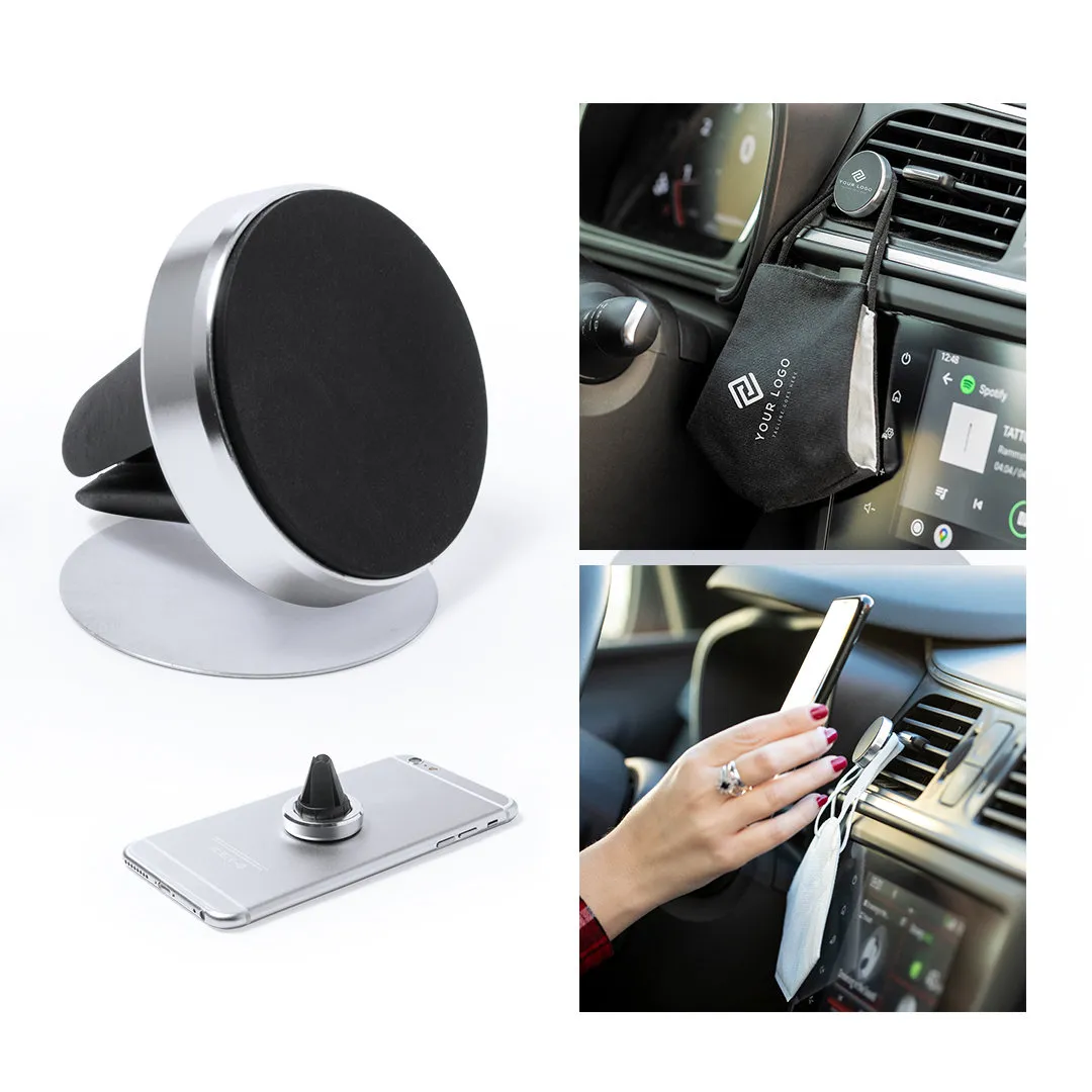 Soporte magnético para smartphone de diseño minimalista y elegante acabado en aluminio. Con sistema de fijación para rejilla de ventilación del automóvil y pastilla circular frontal especialmente diseñada para marcaje en tampografía.