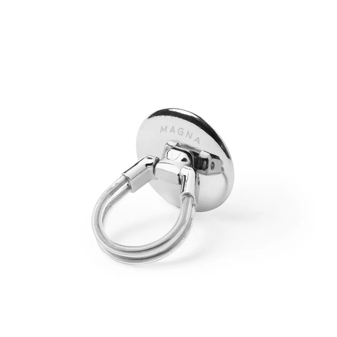Soporte selfie en metal cromado para smartphone. De elegante diseño y con adhesivo 3M, de fijación extra fuerte y libre de residuos al despegarlo del dispositivo. Con doble anilla soporte posterior, para dedo y rejilla del salpicadero del vehículo. Presentado bolsita de diseño individual.