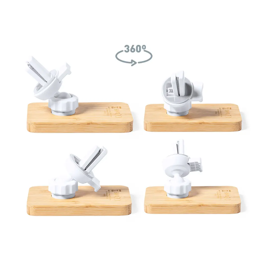 Soporte de rejilla de coche para smartphone de línea nature y fabricado en bambú. Con cargador inalámbrico 15W integrado y fijación magnética para poder usar el dispositivo mientras se está cargando. Incluye anillo adhesivo, siendo válido para todos los dispositivos con tecnología Magsafe y Qi. Presentado en caja individual de diseño eco en cartón kraft.