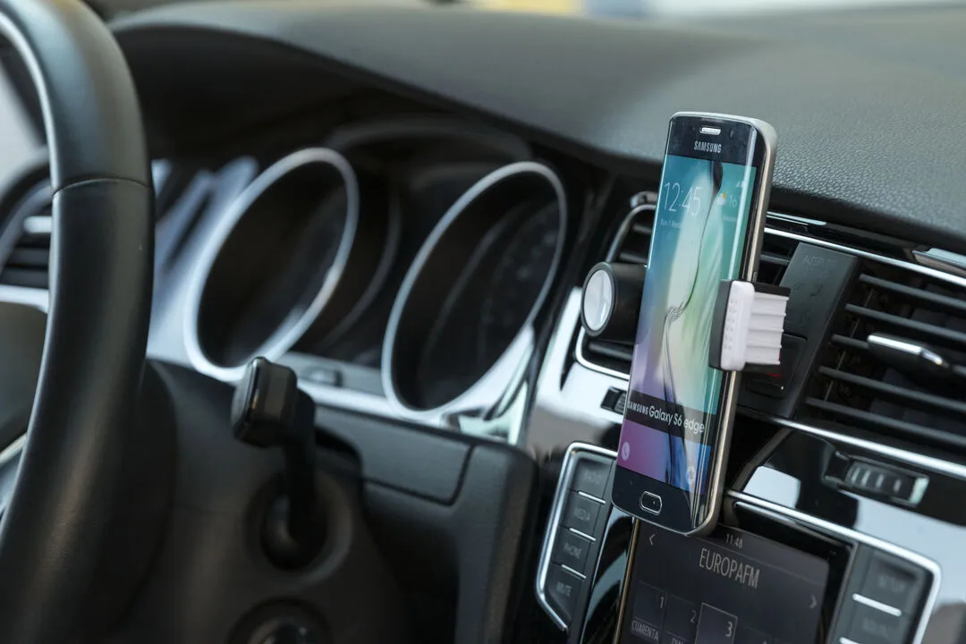 Soporte para smartphone de diseño minimalista y elegante acabado bicolor en blanco y negro. Con sistema de fijación para rejilla de ventilación del automóvil y pastilla circular frontal especialmente diseñada para marcaje en tampografía.