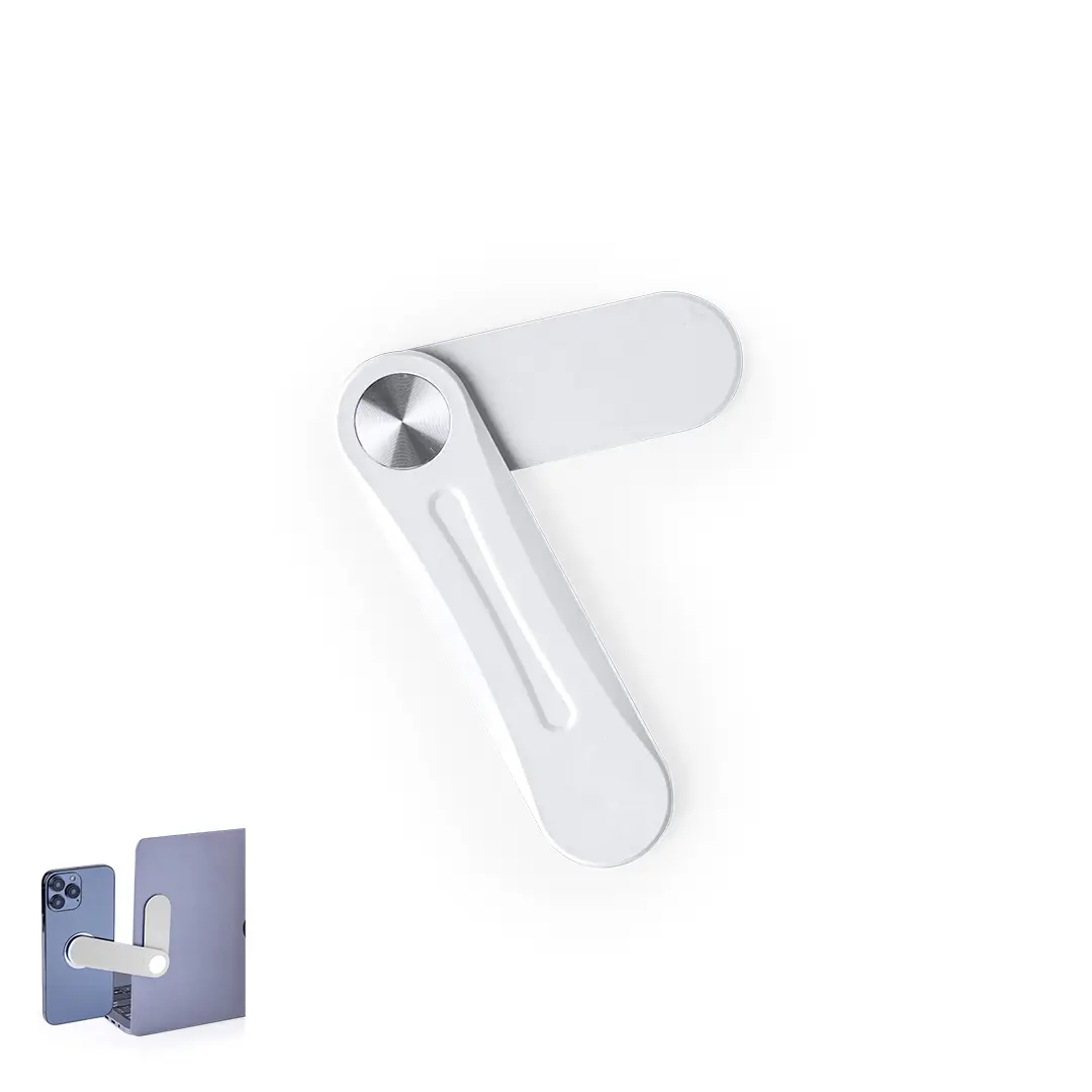 Soporte magnético plegable para smartphone, de diseño minimalista y elegante acabado. Brazo articulado ajustable en altura, con sistema de fijación por adhesivos. Presentado individualmente en bolsa de papel reciclada.