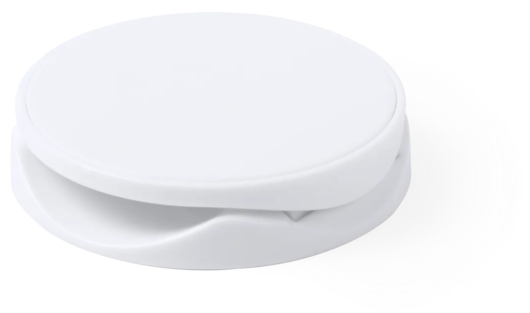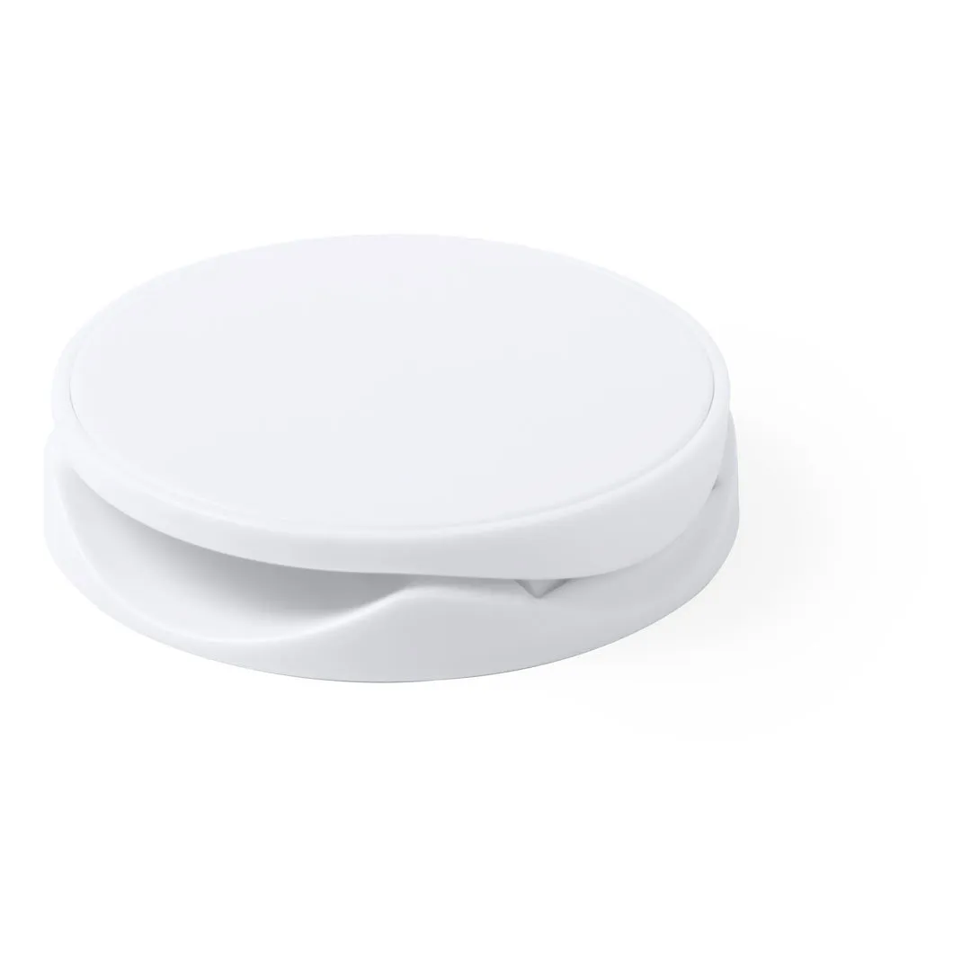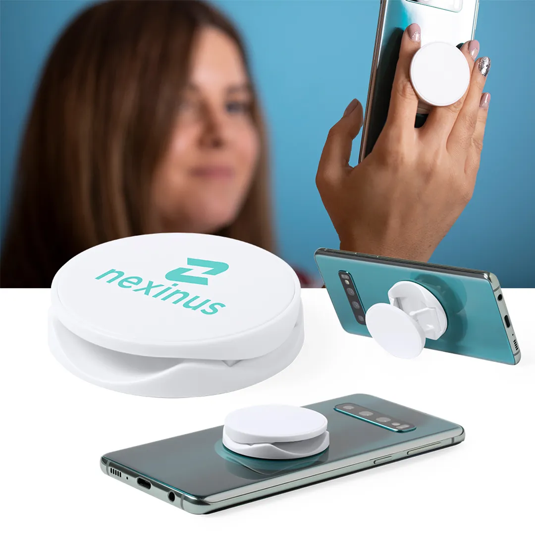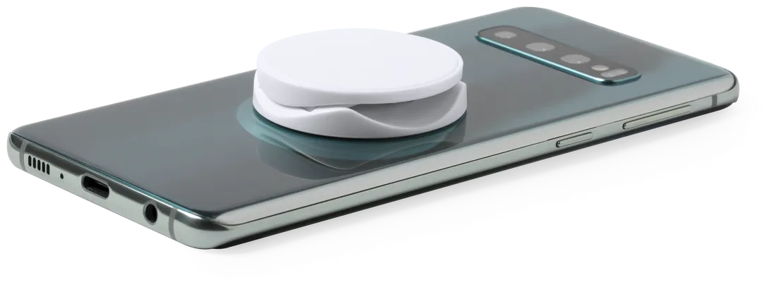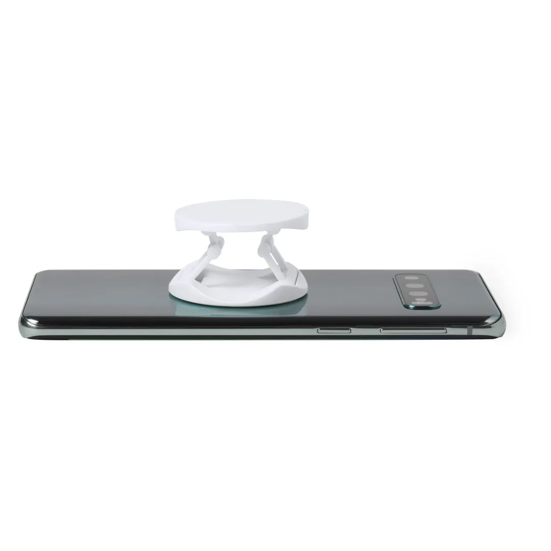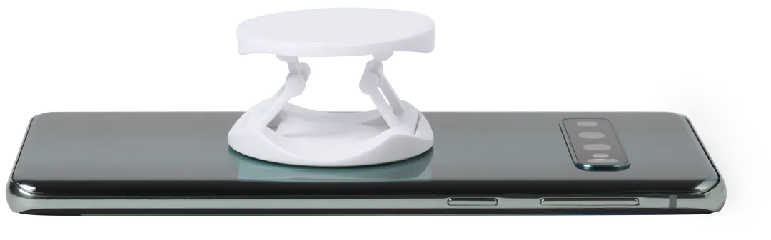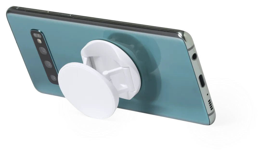 Soporte para smartphone plegable en elegante acabado de color blanco, especialmente diseñado para marcaje en tampografía. Con adhesivo 3M, de fijación extra fuerte y libre de residuos al despegarlo del dispositivo.