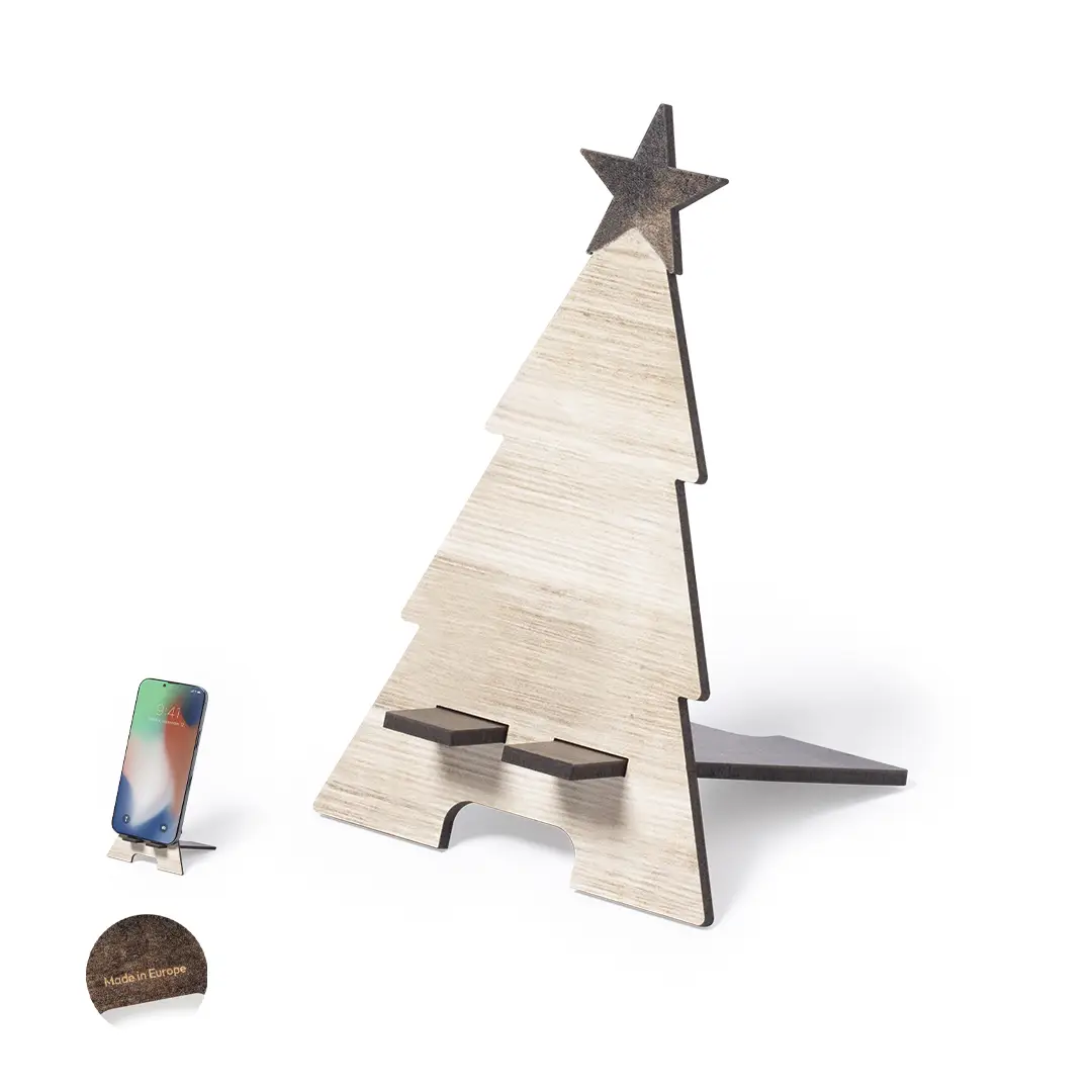 Soporte para smartphone con diseño árbol de navidad, fabricado en madera natural y de original acabado bicolor. De fácil montaje y con distintivo Made In Europe.