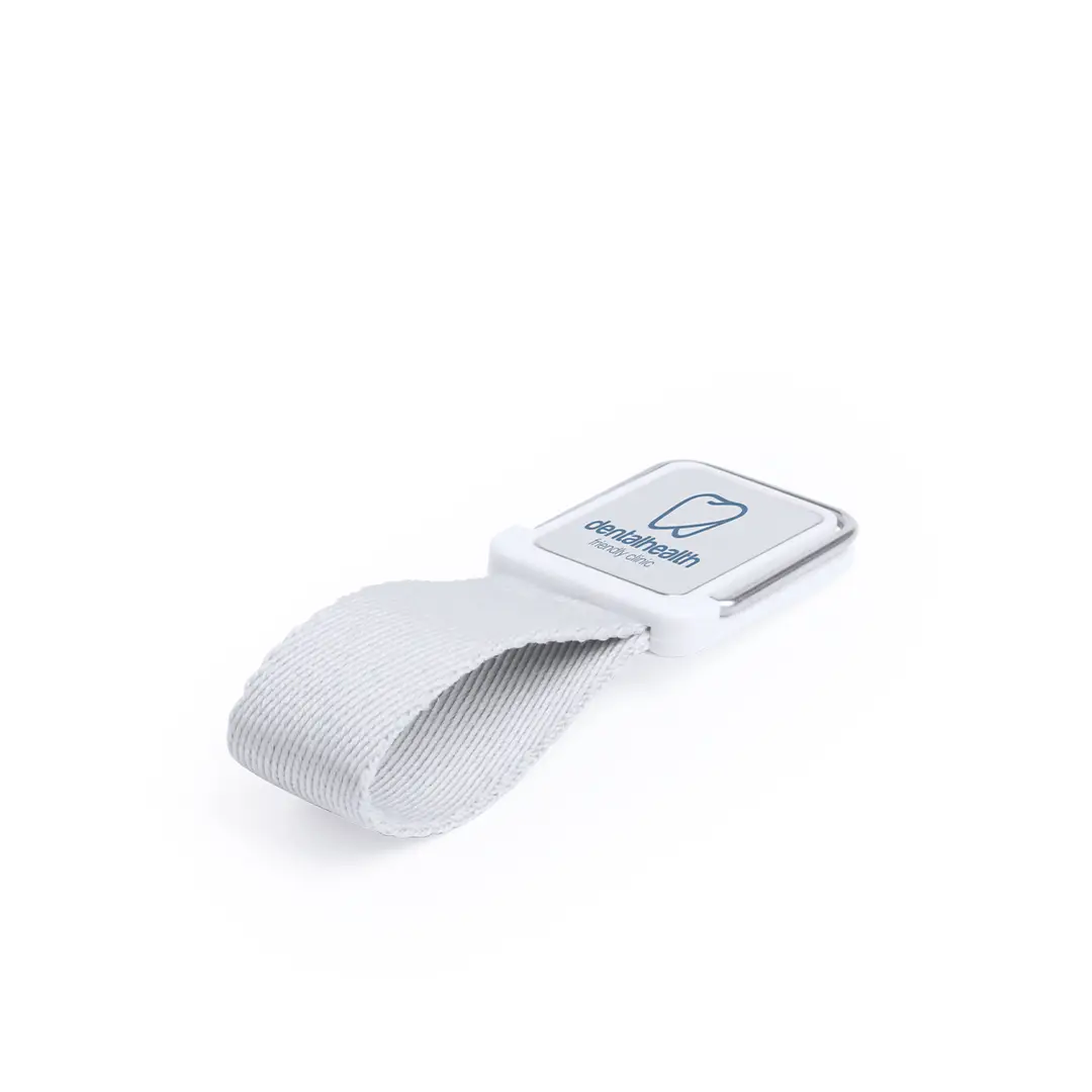 Original soporte adhesivo para smartphone con cinta para selfies en resistente poliéster y pastilla central para marcaje. Con soporte metálico y presentado en atractiva bolsita de diseño.