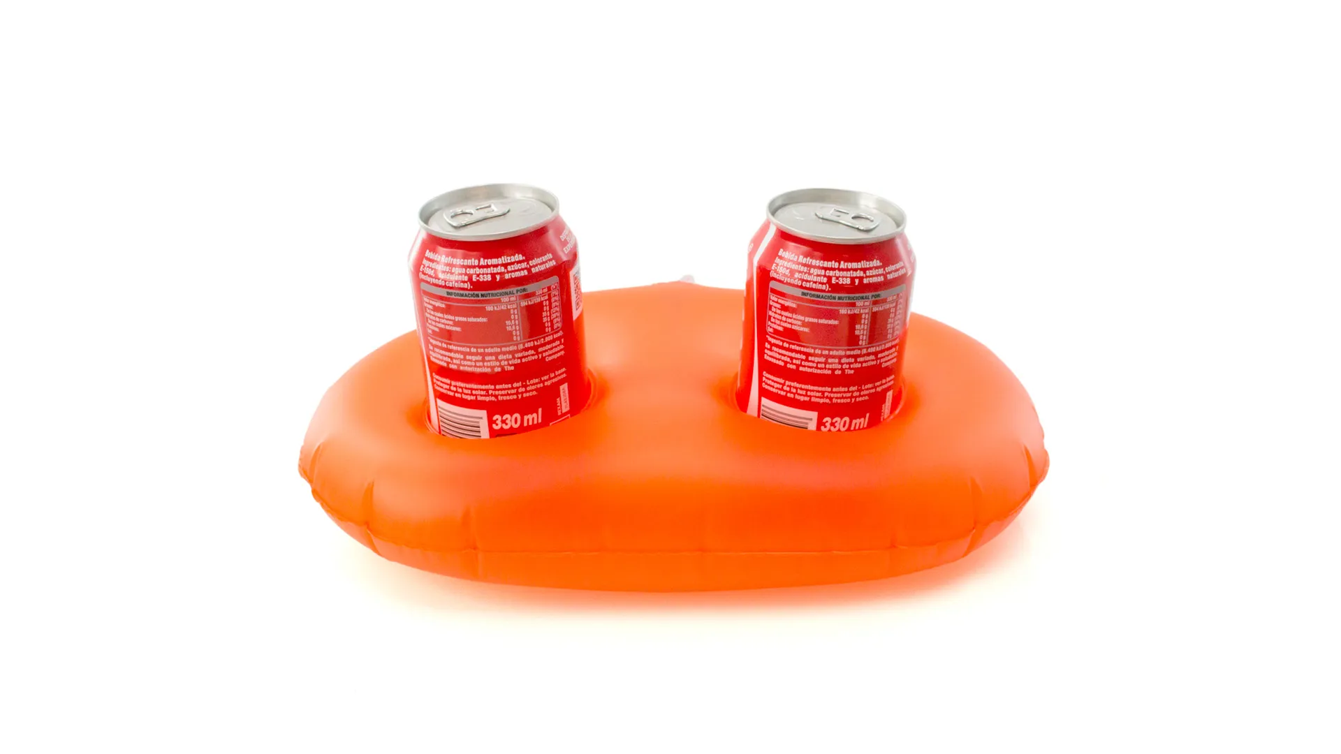 Soporte inflable en resistente PVC para 2 refrescos de 33 cl en vivos colores.