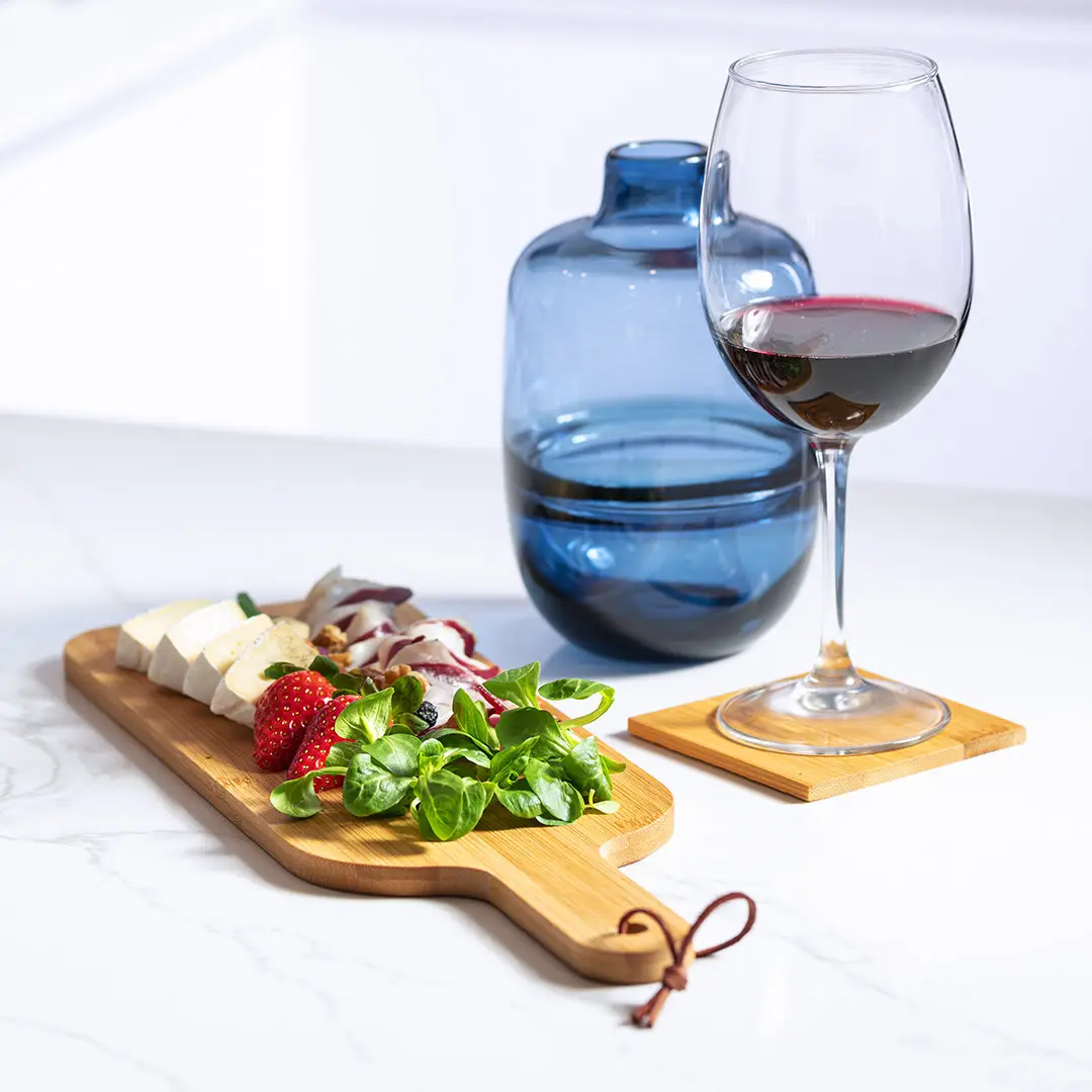 Tabla fabricada en bambú, de suave y resistente acabado pulido. Ideal para corte y presentación. Con asa para fácil manejo y cordón para colgar en símil piel.
