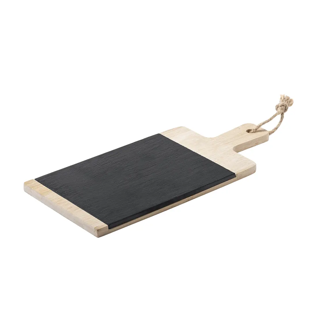 Tabla fabricada en combinación de materiales bambú y pizarra, de suave y resistente acabado pulido. Ideal para corte y presentación. Con asa para fácil manejo y cordón para colgar. Tabla de pizarra extraíble para fácil limpieza. Presentada en atractiva caja individual de diseño eco.