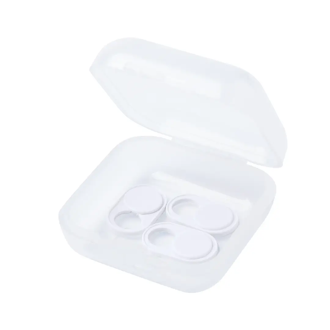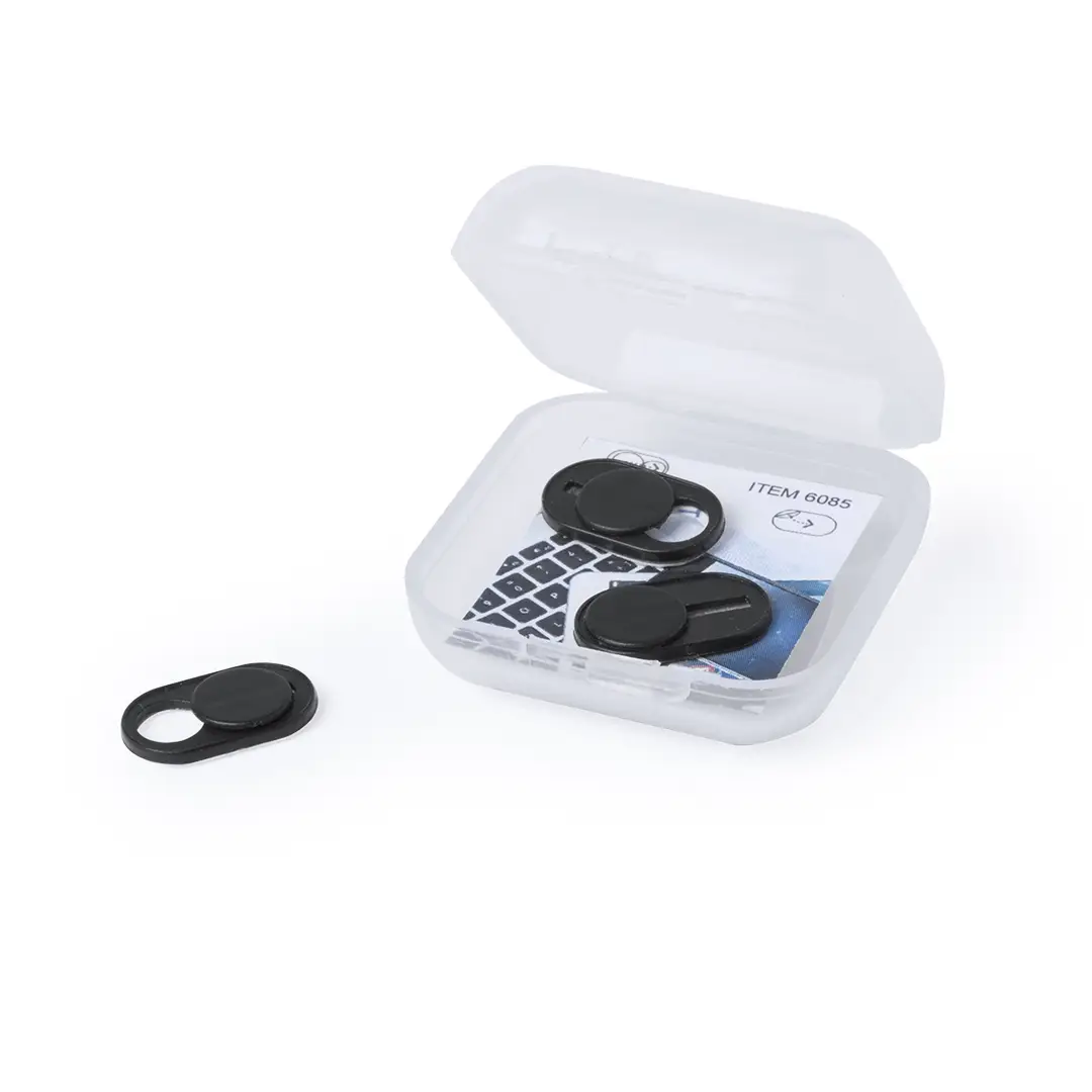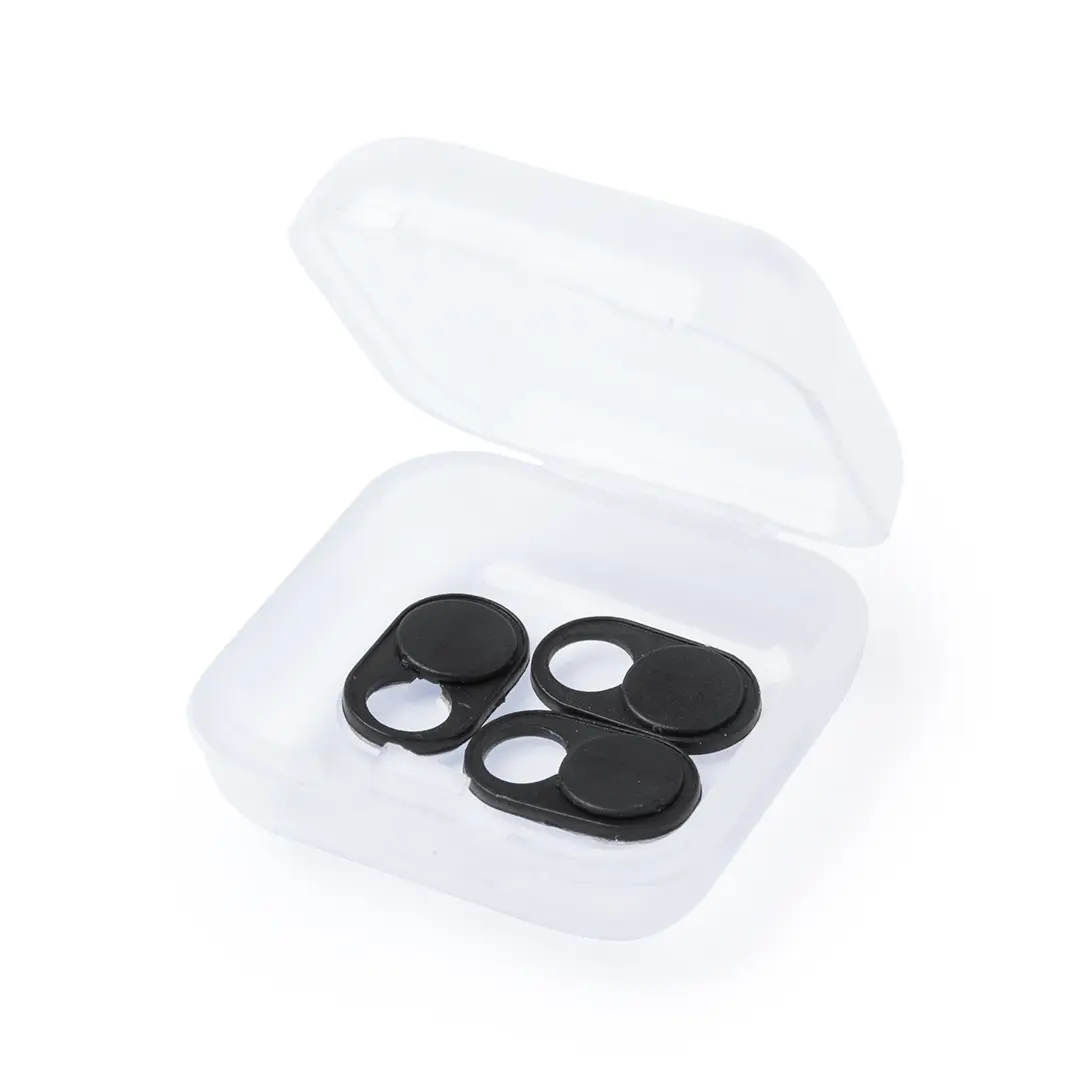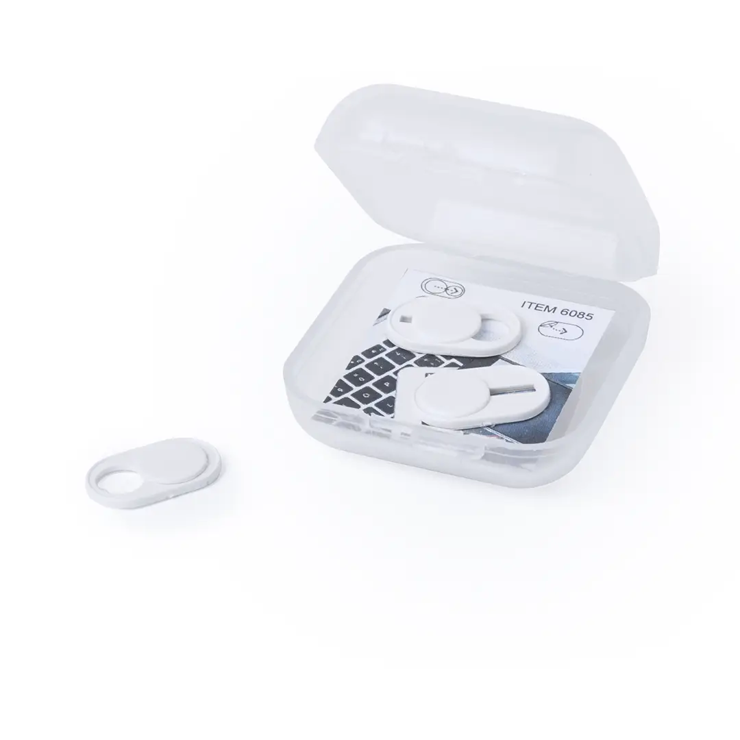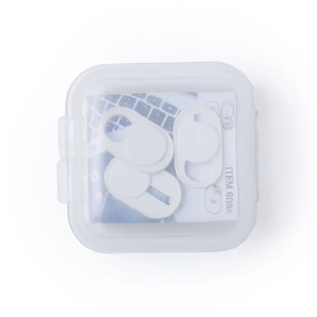 Tapa para cámara de dispositivo móvil para proteger la privacidad. En tamaño ultra compacto y servida en estuche individual de achado translúcido con 3 piezas. Disponible en colores blanco y negro, set presentado en bolsita individual con cartulina de diseño.