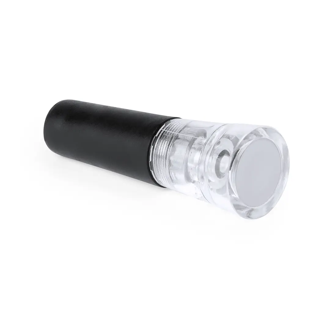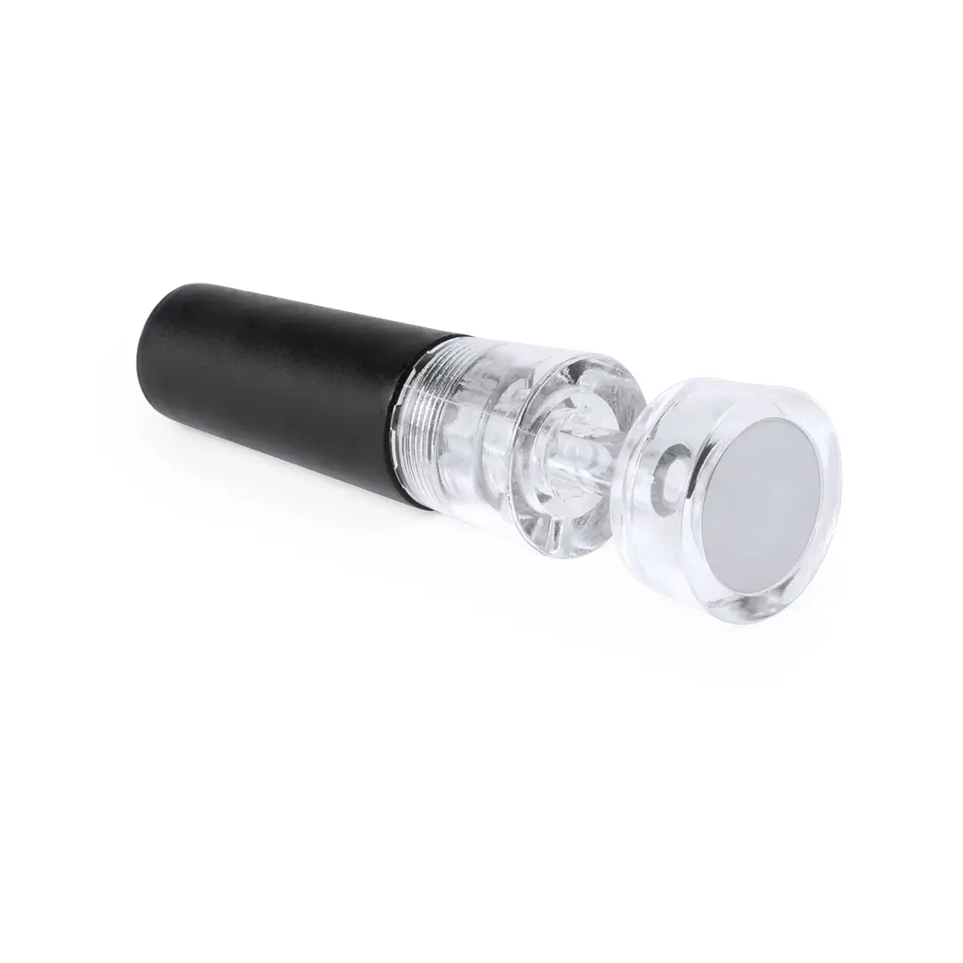Tapón con bomba de vacío para botellas de vino en elegante diseño de color negro y transparente. Parte superior del tapón metálica para marcaje en láser o tampografía. Presentado en caja individual.