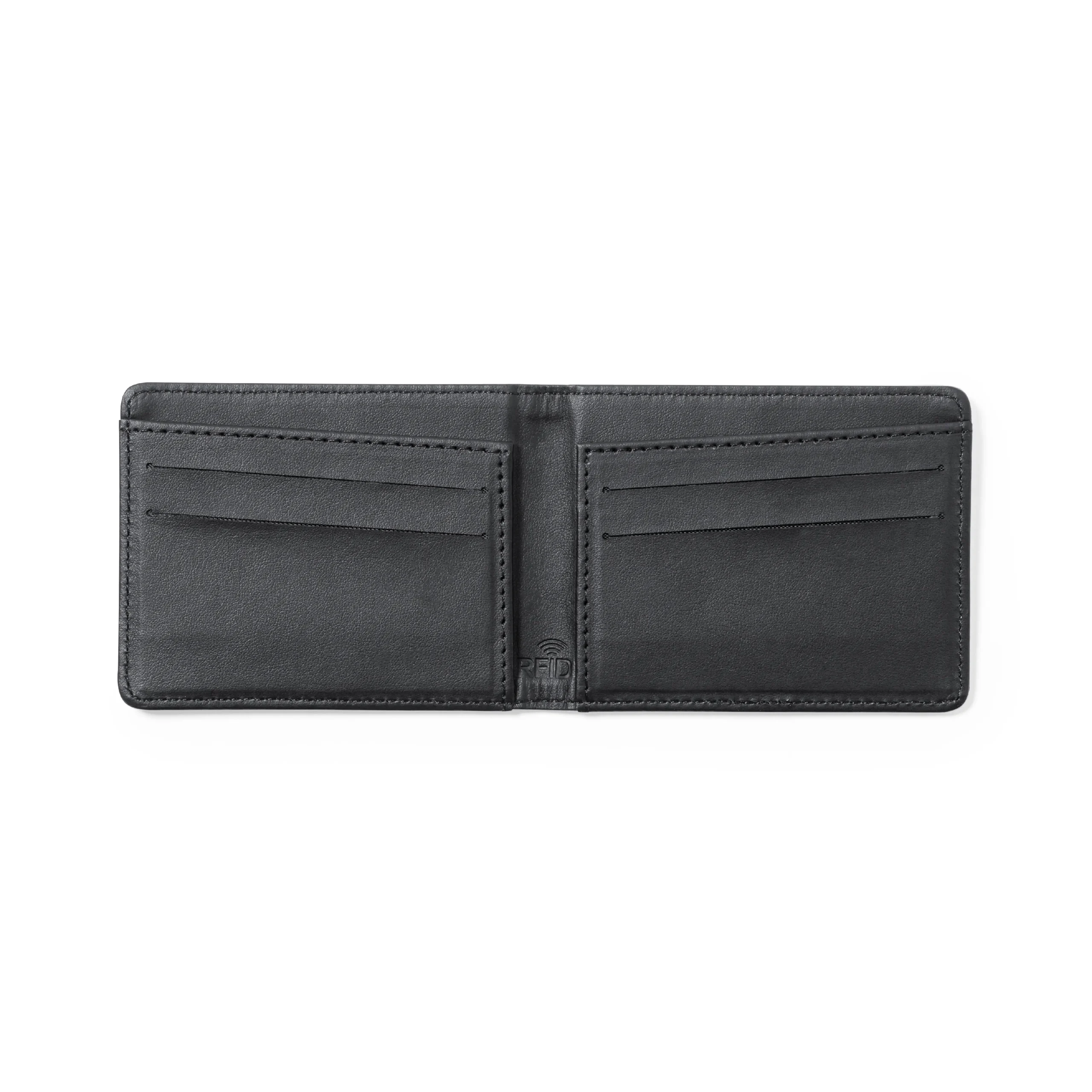 Elegante tarjetero billetero fabricado en poliéster RPET de acabado en color negro. Interior con 6 compartimentos independientes para tarjetas y amplio billetero. Con tecnología de seguridad RFID (Identificación por Radio Frecuencia) que mantiene seguros tus dispositivos de transmisión de identidad. Distintivo RPET en el exterior y RFID en el interior. El material RPET se elabora a partir de plástico reciclado, para así fomentar la reutilización de residuos plásticos y ayudar a la sostenibilidad del planeta.