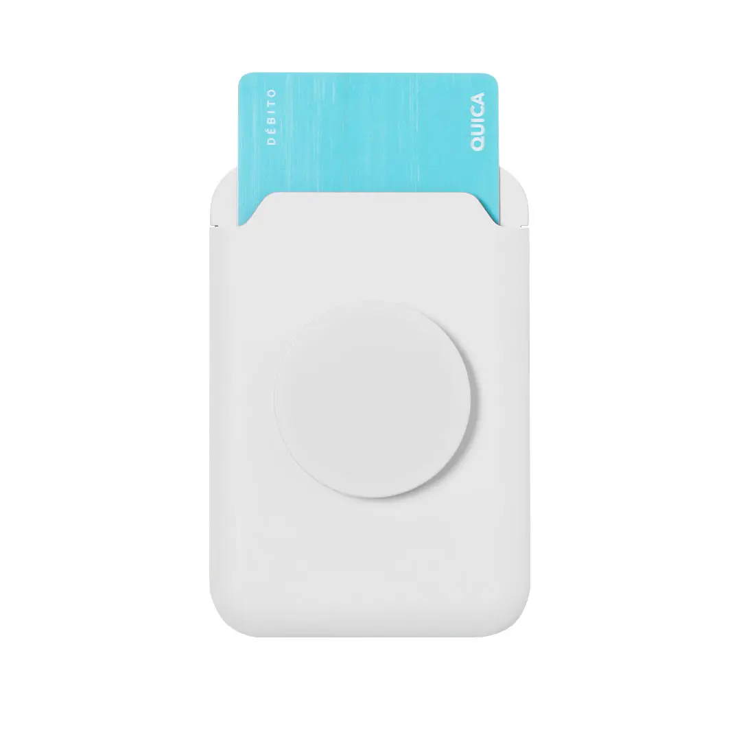 Tarjetero con soporte plegable para smartphone. Diseñado para guardar hasta dos tarjetas, incluye un aro metálico adhesivo para una sujeción y anilla extraible y ajustable para un mejor uso, en color abado brillo.