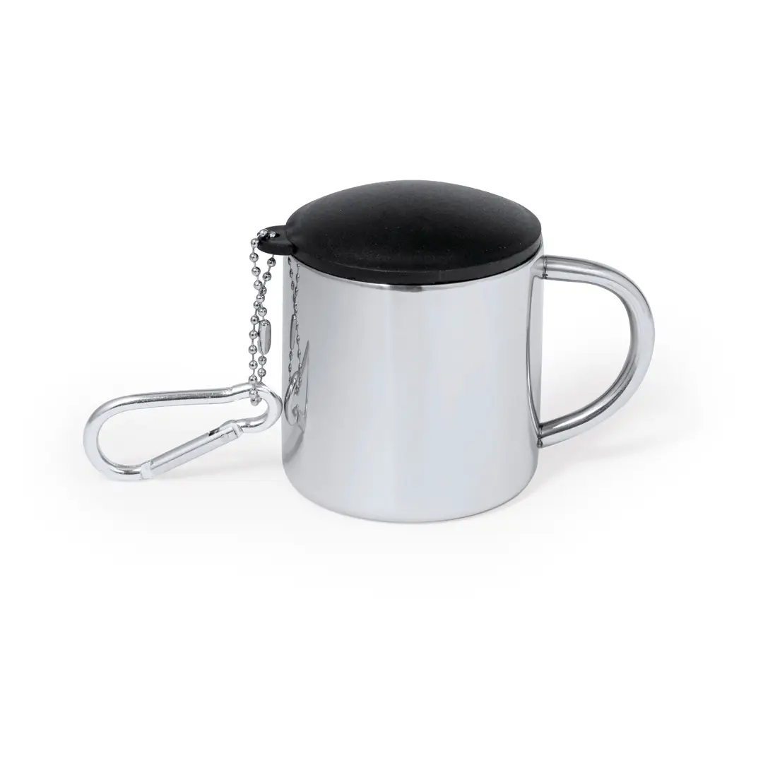 Taza doble pared en acero inox de 145 ml. De diseño brillante con tapadera negra de presión con sellado óptimo por su aro de silicona, tiene un práctico enganche con mosquetón para un fácil transporte. Presentada en caja individual de diseño kraft.
