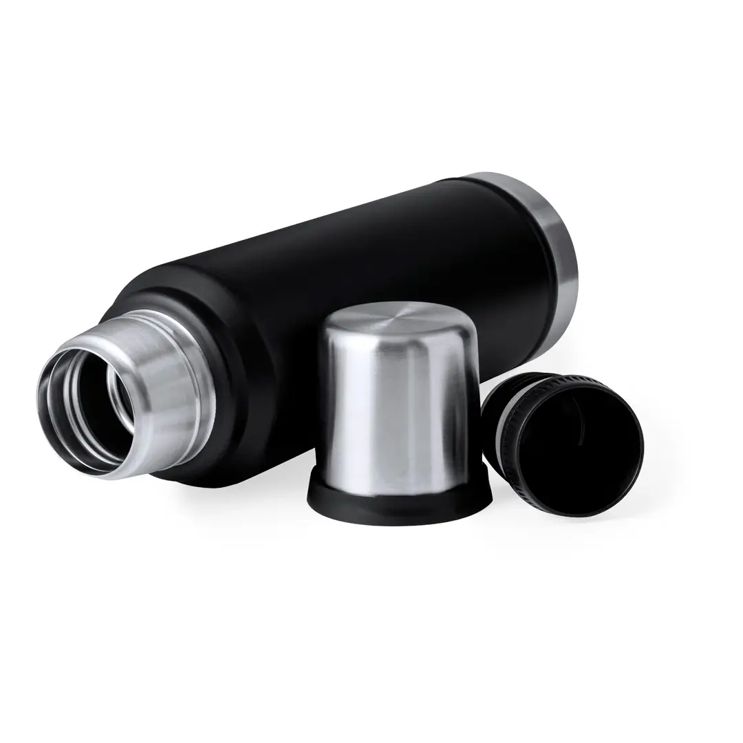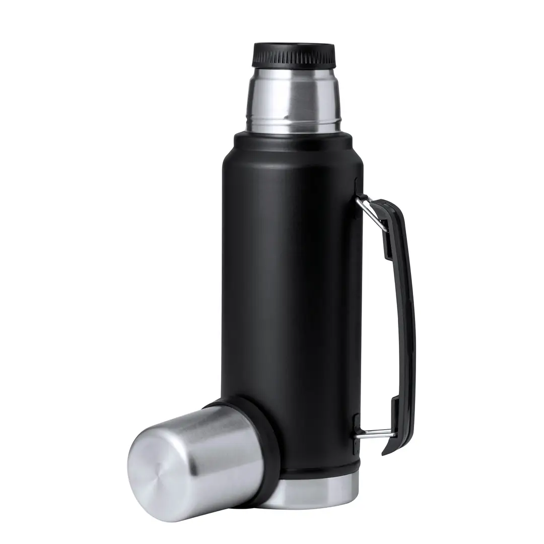 Termo de acero inox de 1L de capacidad. Combinación de color negro con acero pulido de elegante acabado, de cierre de rosca con tapón en forma de vaso de 200 ml y asa en el lateral para un fácil transporte. Presentado en caja de diseño kraft.