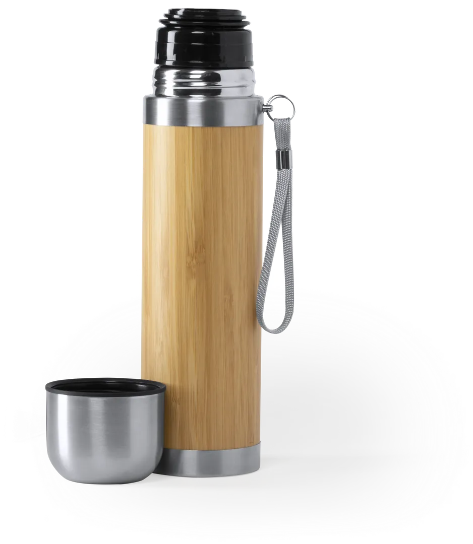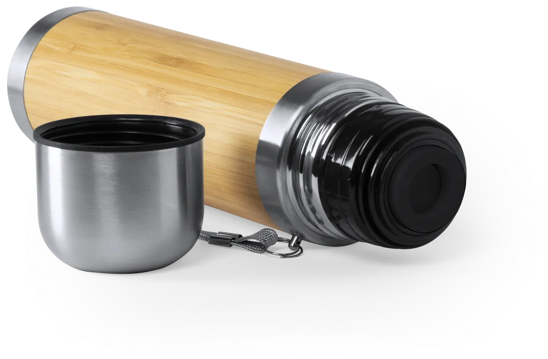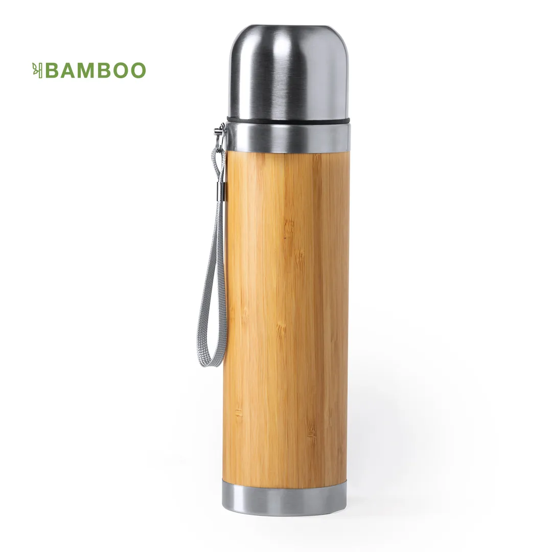 Termo de línea nature en combinación de materiales bambú y acero inox, libre de BPA. 420 ml de capacidad, con doble cobertura para mejor y más duradera conservación de la temperatura. Cierre a rosca, con tapón taza en acero inox y cómoda cinta de transporte. Presentado en atractiva caja de diseño eco.