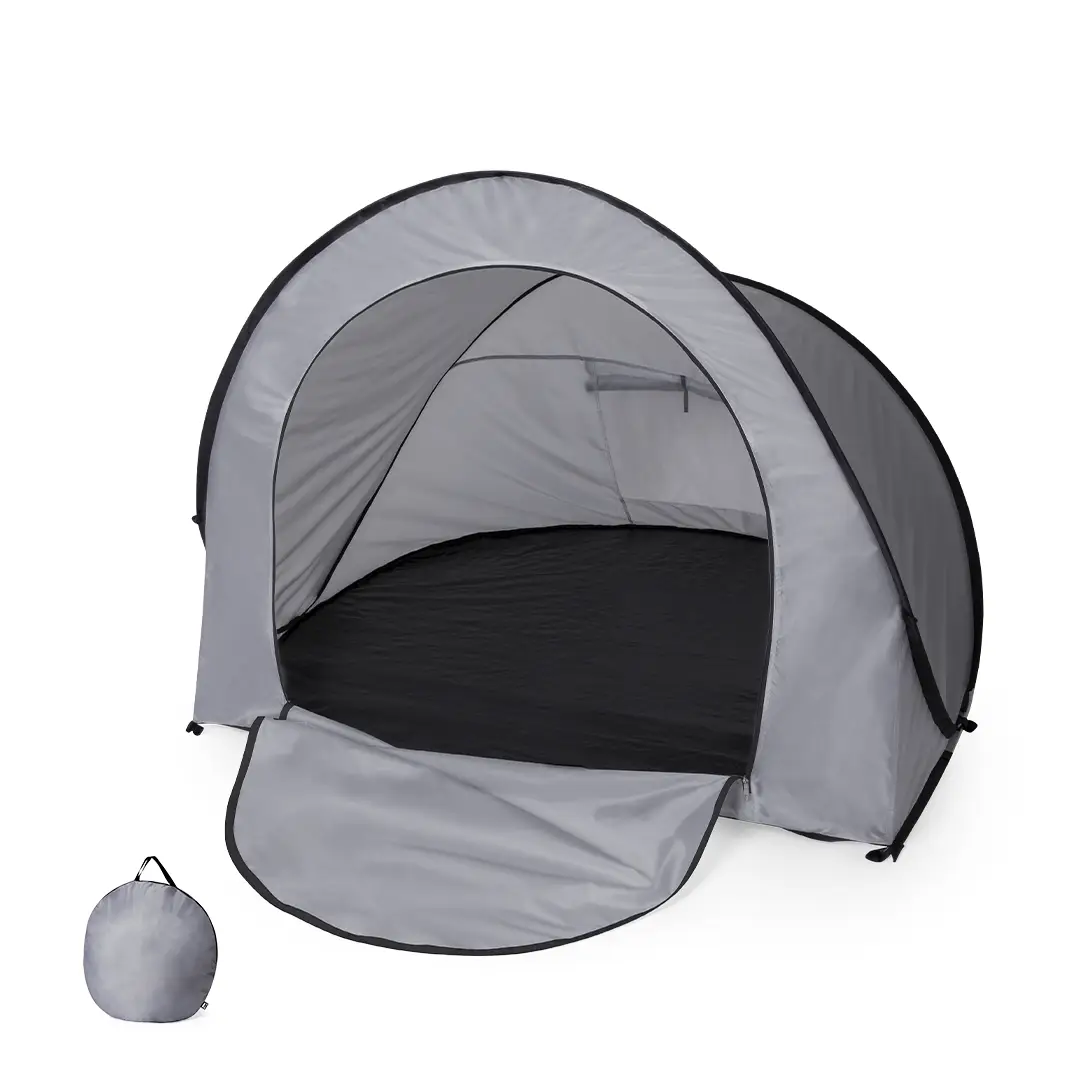 Tienda de campaña automontable, solo hay que sacarla de la funda y se despliega automáticamente. Fabricada en resistente poliéster RPET, con estructura metálica y detalles en color negro. Amplia puerta de entrada, con cierre de cremallera de doble tirador interior y exterior. Ventana en parte posterior con mosquitera, cierre de velcro y cortina enrollable con cordón y cinta de sujeción. Ideal para 2 personas y de fácil plegado. Presentada en funda a juego, con distintivo RPET en etiqueta exterior. El material RPET se elabora a partir de plástico reciclado, para así fomentar la reutilización de residuos plásticos y ayudar a la sostenibilidad del planeta.