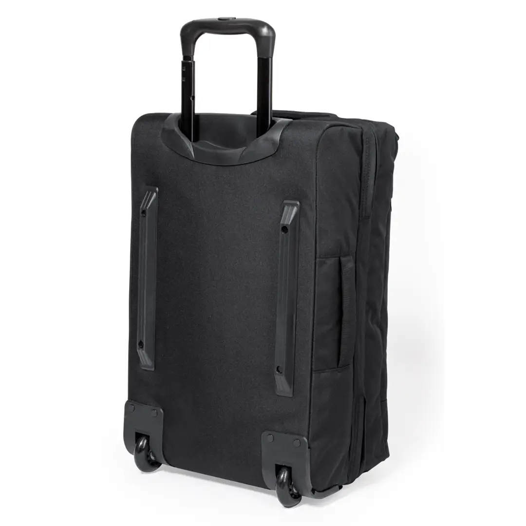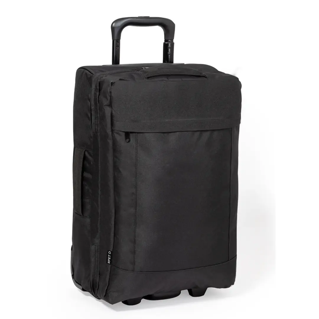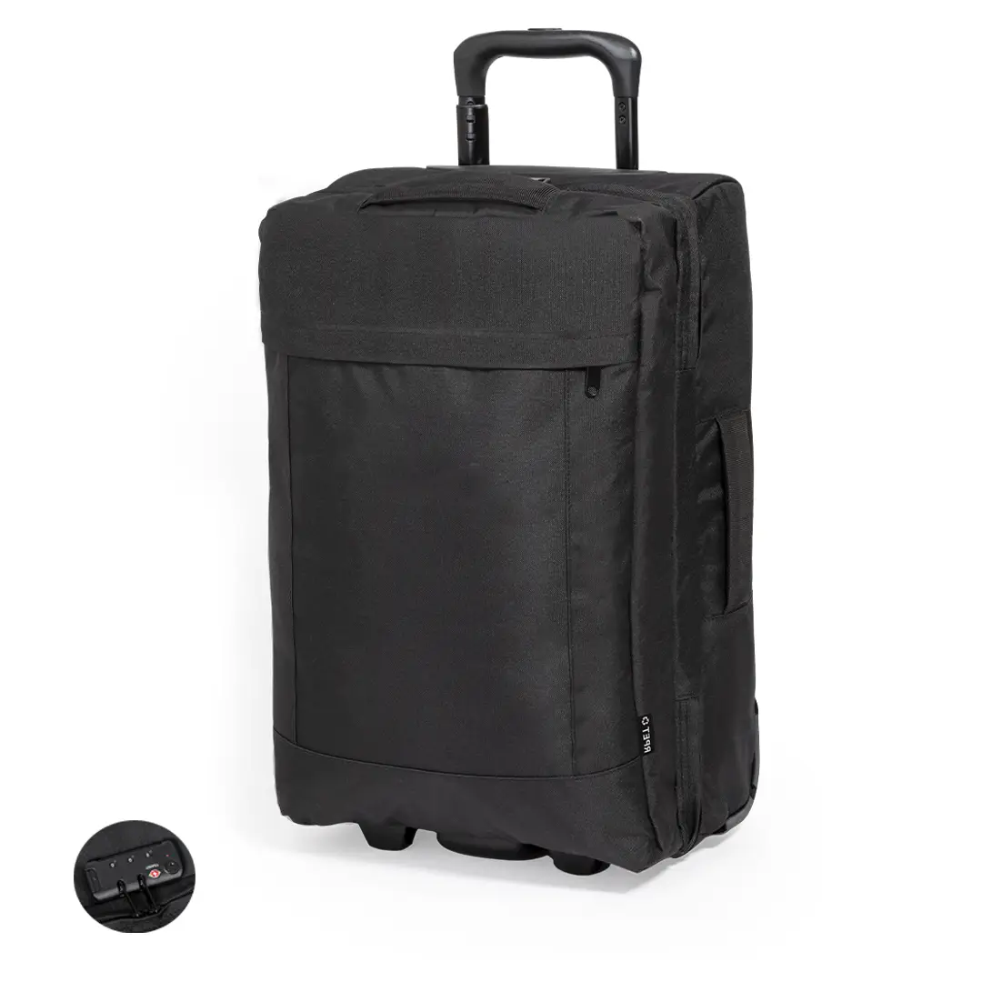 Trolley fabricado en resistente 600D RPET. Compartimento principal con cierre de cremallera de doble tirador conforme a los estándares TSA -Administración de la Seguridad en el Transporte-, que permite a las autoridades de aduanas inspeccionar el contenido del equipaje sin tener que forzar o romper el cierre, usando una llave especial a disposición de la autoridad.Interior forrado además de organizador en la zona central. Exterior con bolsillo frontal con cierre de cremallera invisible y 2 asas acolchadas de transporte. Mecanismo extensible metálico en negro, con cómoda asa de transporte y 2 ruedas. Logotipo RPET en etiqueta exterior.El material RPET se elabora a partir de plástico reciclado, para así fomentar la reutilización de residuos plásticos y ayudar a la sostenibilidad del planeta.