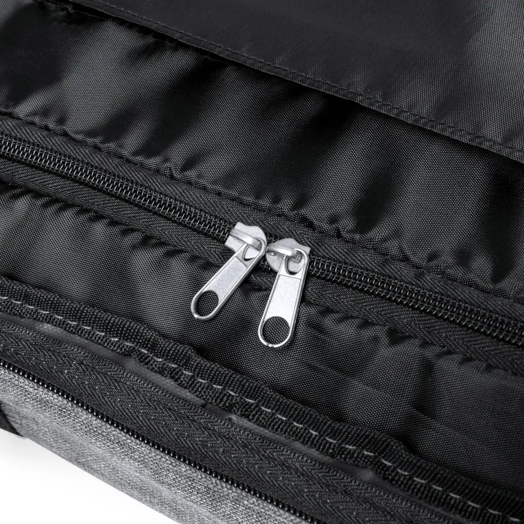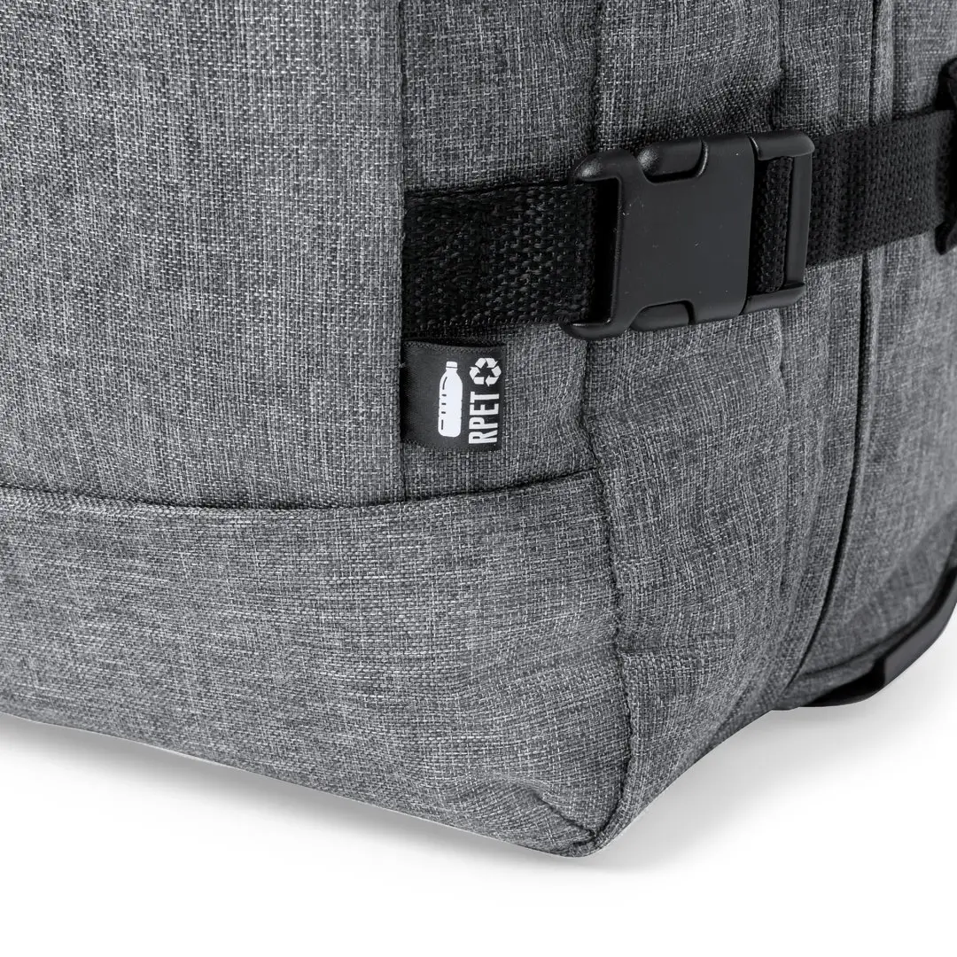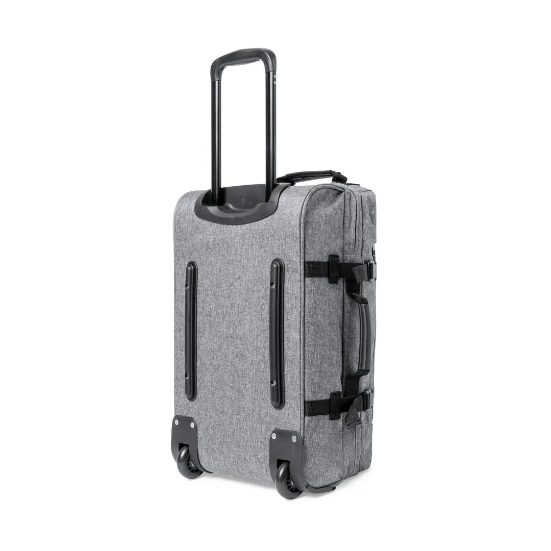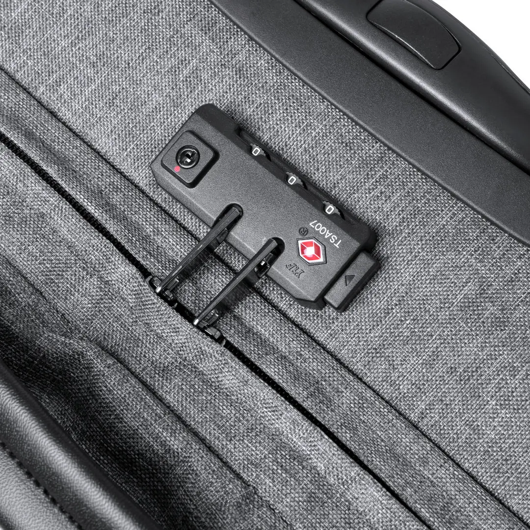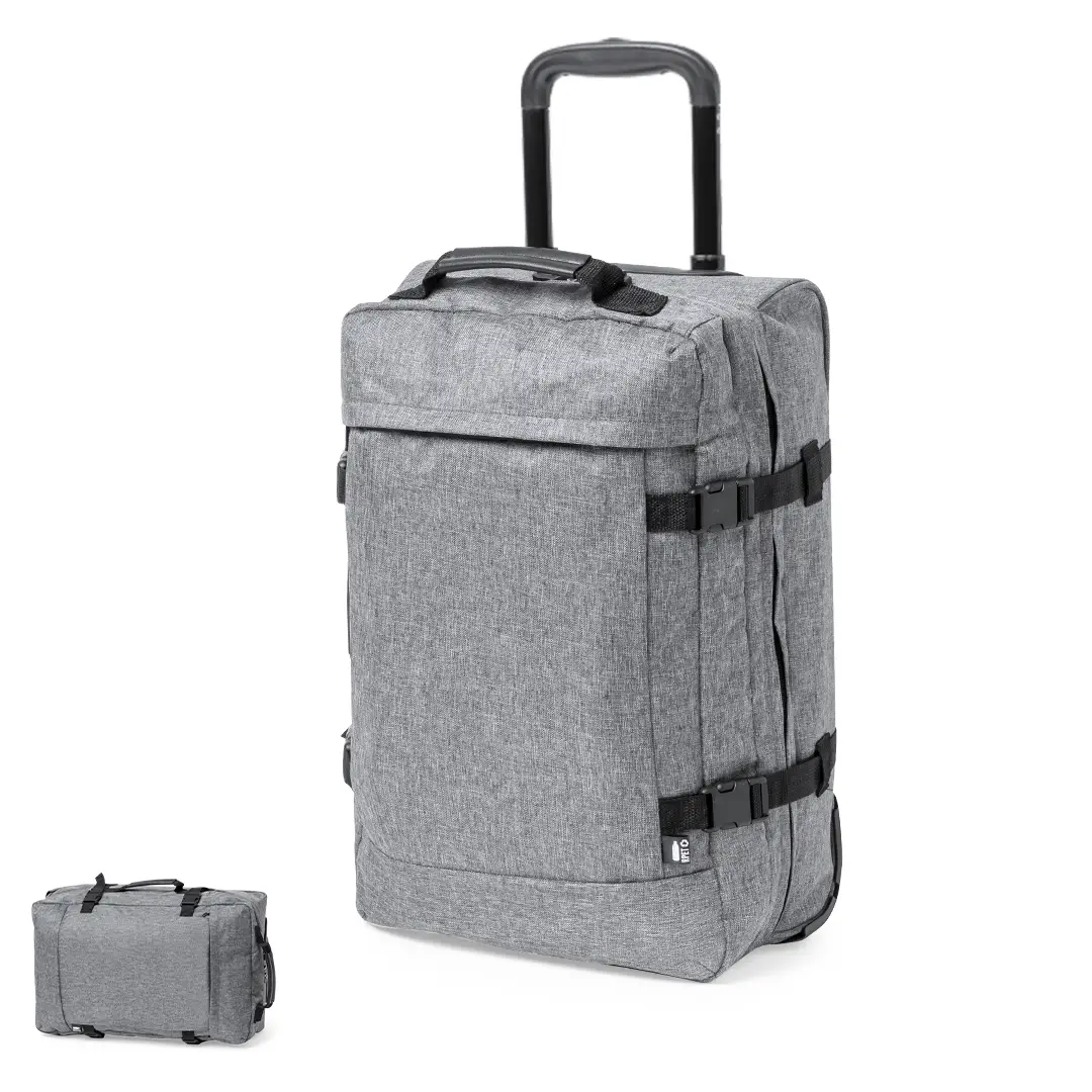 Trolley de línea nature fabricado en resistente 300D RPET. Compartimento principal con cierre de cremallera de doble tirador conforme a los estándares TSA -Administración de la Seguridad en el Transporte-, que permite a las autoridades de aduanas inspeccionar el contenido del equipaje sin tener que forzar o romper el cierre, usando una llave especial a disposición de la autoridad. Interior forrado y con cintas elásticas de sujeción. Exterior con 2 cintas ajustables, cierres de hebilla, bolsillo frontal con cierre de cremallera invisible y 2 asas acolchadas de transporte. Mecanismo extensible metálico en negro, con cómoda asa de transporte y 2 ruedas. Distintivo RPET en etiqueta exterior.