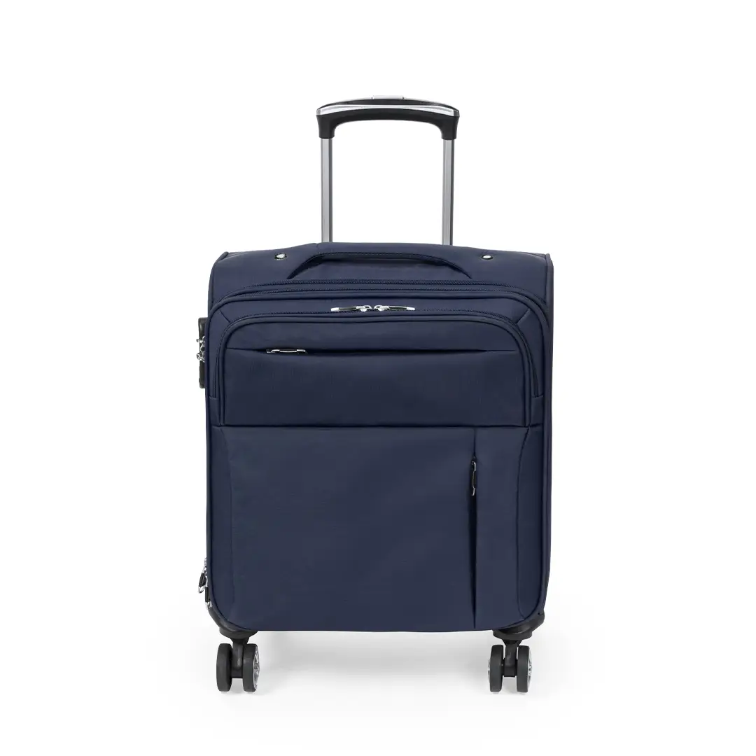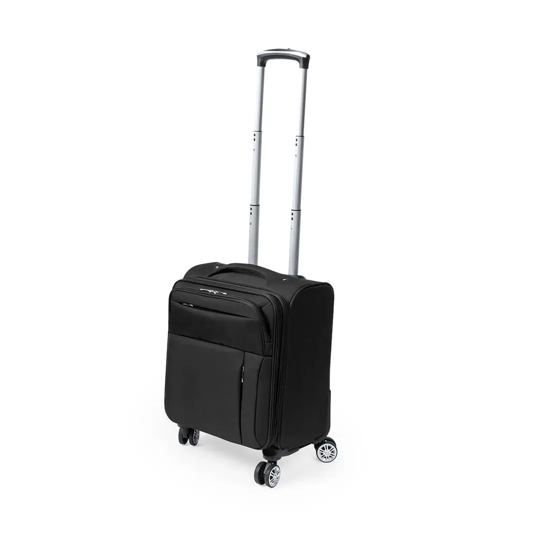 Trolley de negocios de apertura total con 4 ruedas telescópicas acabado en nylon. De sobrios colores, con asa exterior reforzada a juego y prácticos bolsillos en parte frontal. Con identificador, cierre de seguridad de combinación numérica y cremalleras a juego, incluye además compartimento interior acolchado para ordenador portátil de hasta 15 pulgadas y multitud de bolsillos interiores.