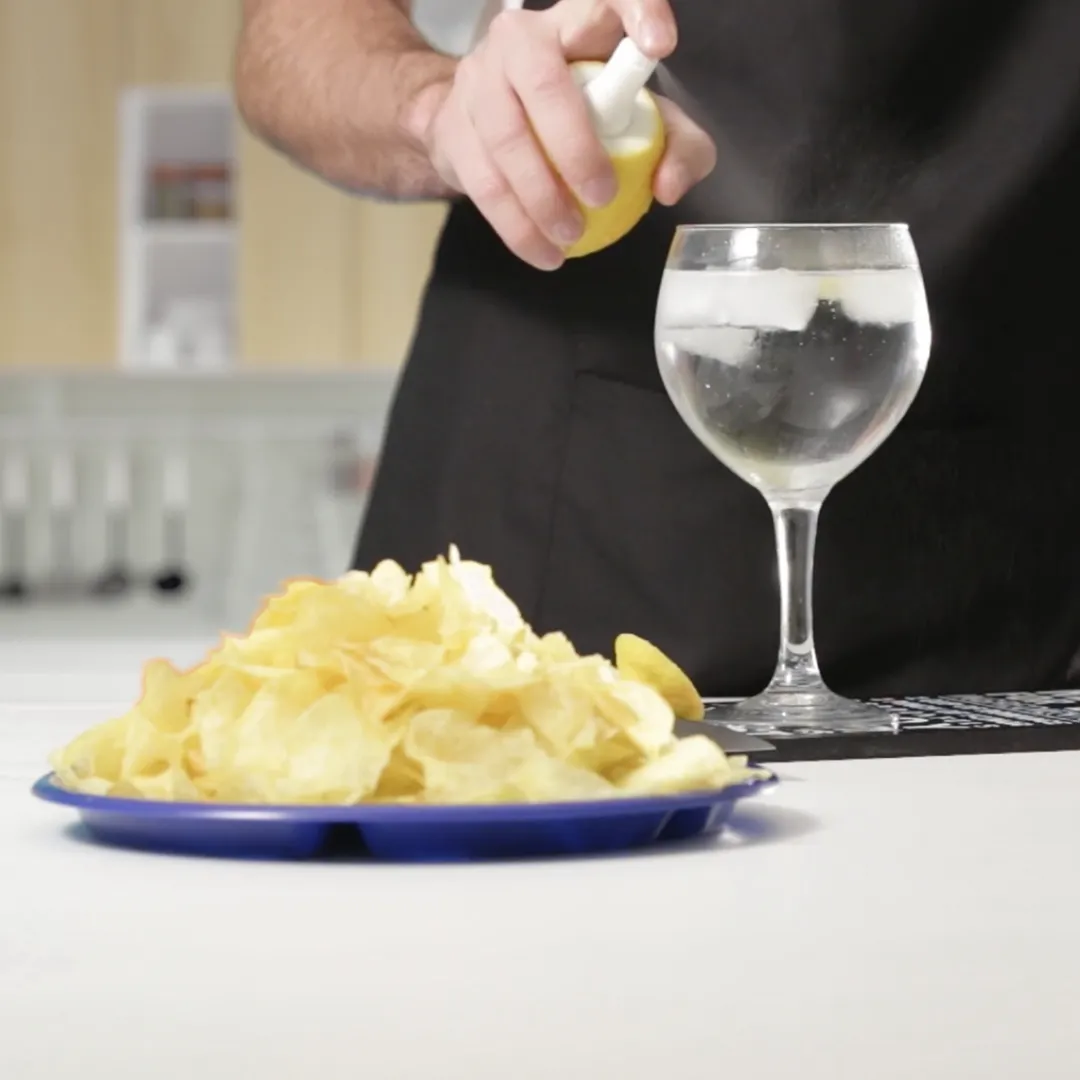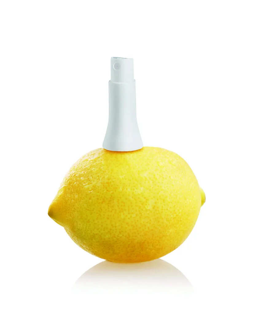 Original vaporizador para cítricos. Al presionar la base punzante sobre el cítrico se accede a su interior, y pulsando el vaporizador se extrae el líquido.