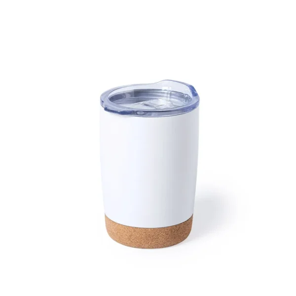 Vaso de sobremesa fabricado en combinación de base en corcho natural con cuerpo en acero inox de acabado blanco, de 380 ml de capacidad. Con doble cobertura para mejor y mas duradera conservación de la temperatura y original tapón dosificador con abrefácil transparente. Presentado en atractiva caja de diseño.