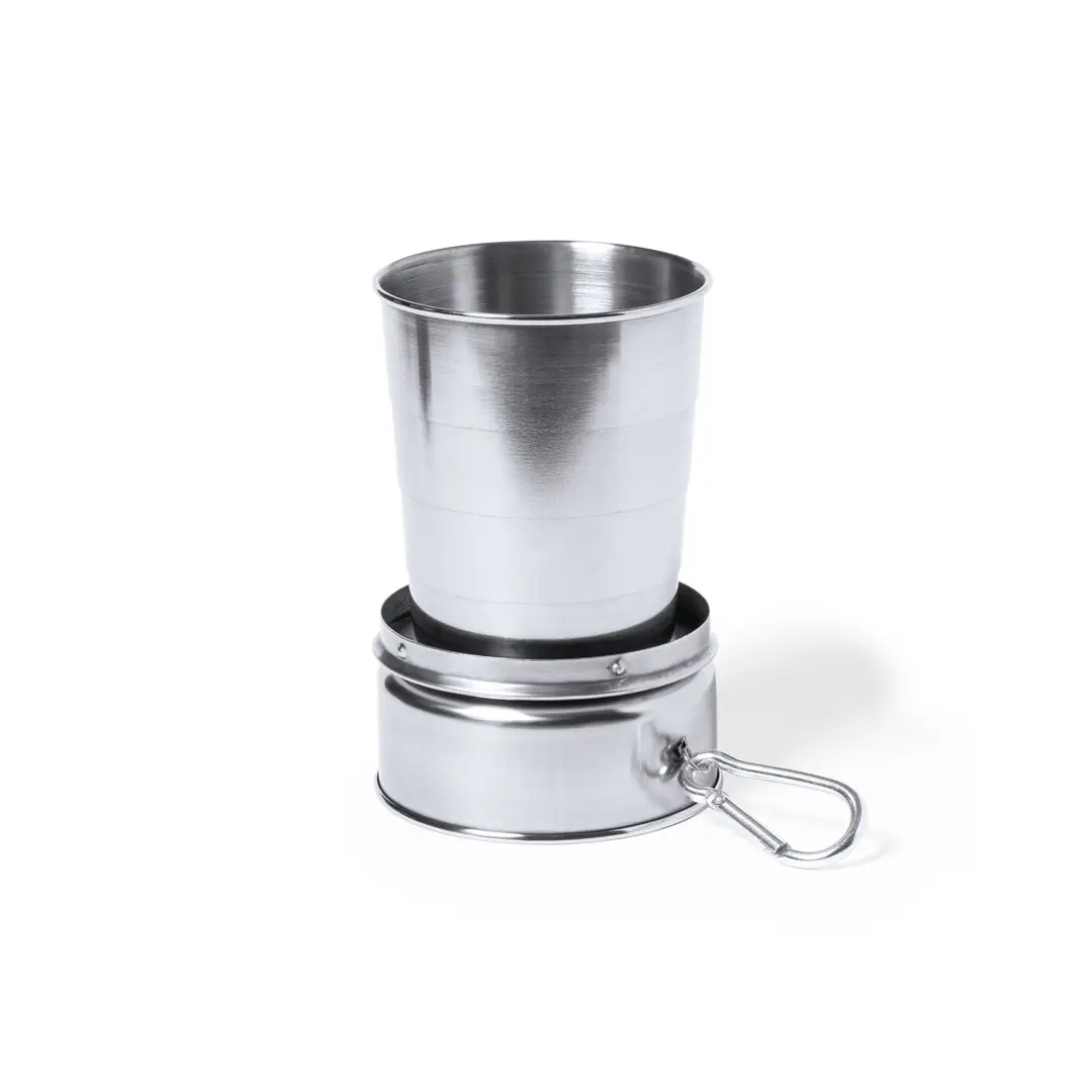 Original vaso plegable para emergencias fabricado en acero inox. De 220ml de capacidad y con mosquetón metálico de transporte.